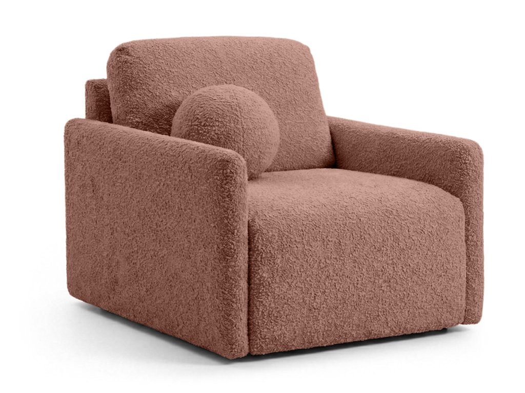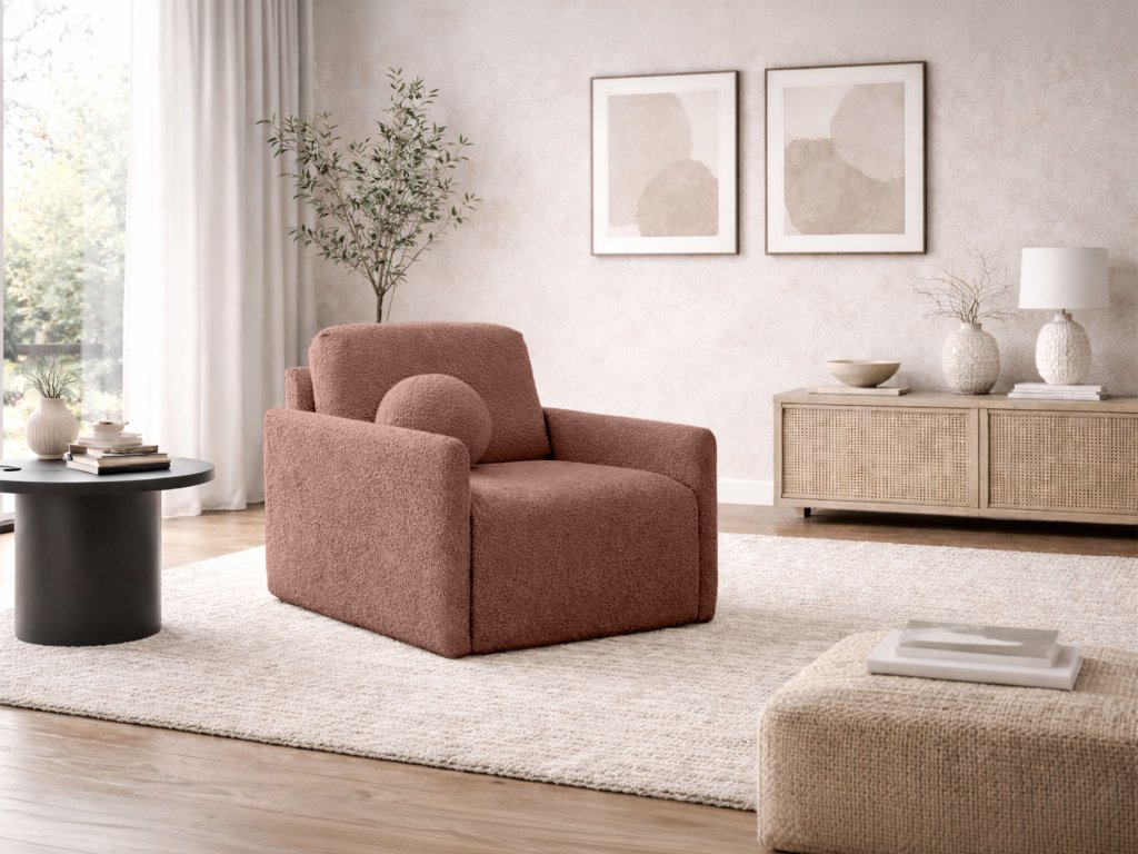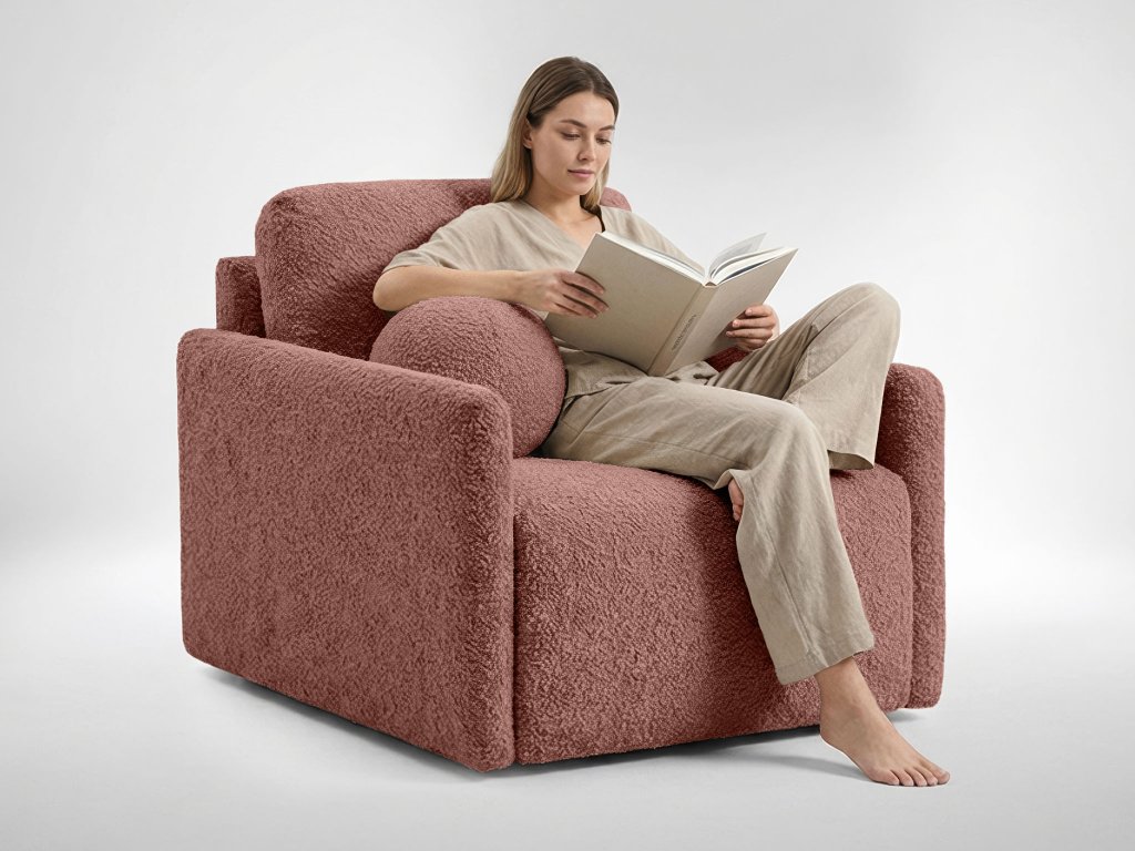 Povrch kresla tvorí kvalitná látka Abriamo. Tento materiál typu bouclé s charakteristickou uzlíkovou štruktúrou je mimoriadne príjemný na dotyk a momentálne patrí medzi svetové trendy. S vysokou gramážou 540 g/m2 a odolnosťou voči oderu 45 000 cyklov Martindale ide o materiál pripravený na každodennú záťaž. Tehlový odtieň je stály na svetle a látka prešla cigaretovým testom pre vyššiu bezpečnosť.