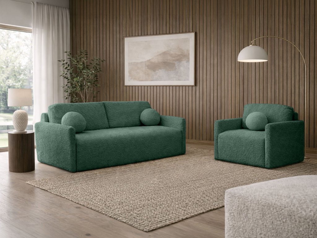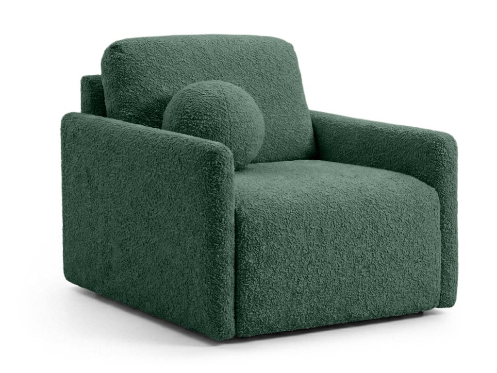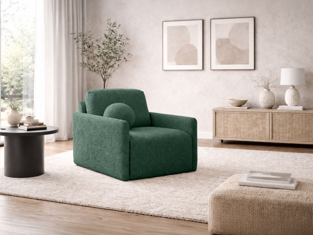 Povrch kresla tvorí obľúbená látka Abriamo. Tento materiál typu bouclé je známy svojou huňatou uzlíkovou štruktúru, ktorá je veľmi príjemná na dotyk. S gramážou 540 g/m2 a odolnosťou voči oderu 45 000 cyklov Martindale ide o látku, ktorá znesie časté používanie. Zelený odtieň je stály na svetle a materiál prešiel cigaretovým testom, čo zvyšuje bezpečnosť vašej domácnosti.