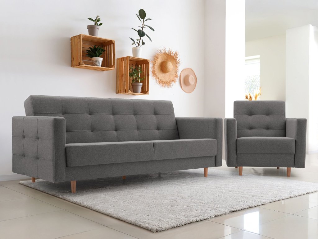 - Materiál: čalúnenie látkou Norn 15, drevené nožičky, masívne drevo, nábytková doska, pružiny Bonell, elastická pena T30