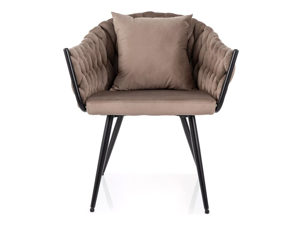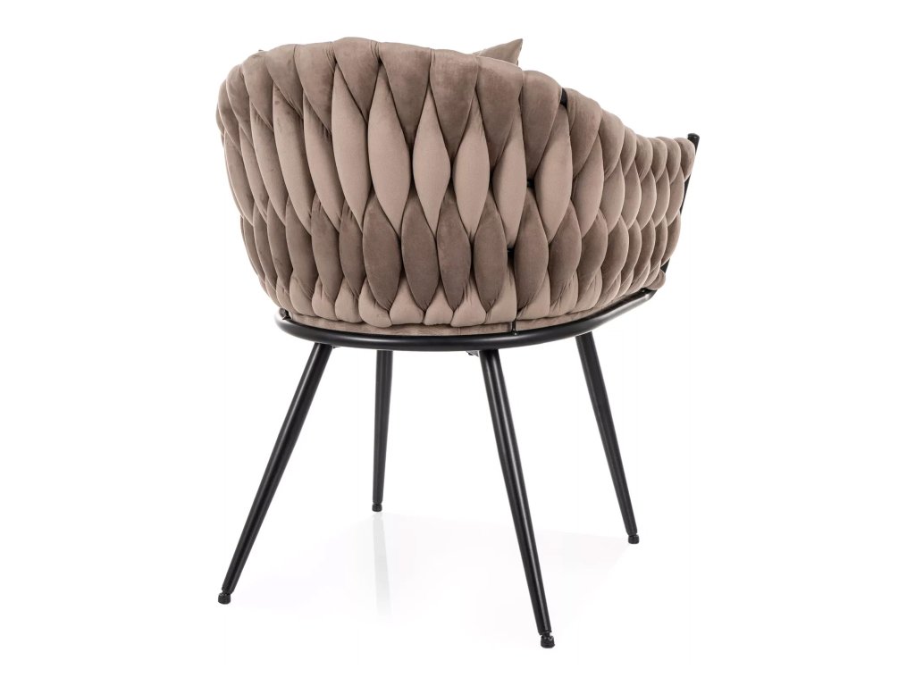 Kreslo Nuvo – spojenie elegancie a moderného pohodlia. Kreslo Nuvo zaujme už na prvý pohľad svojím nadčasovým dizajnom, ktorý kombinuje prepletaný šarm s modernou estetikou. Tmavo béžové čalúnenie z hebkej zamatovej látky dodáva kreslu luxusný vzhľad a zároveň príjemný dotykový komfort.