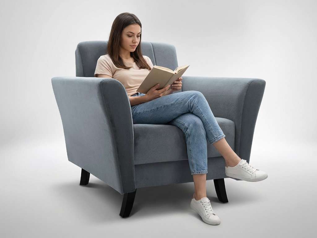 Kreslo je čalúnené kvalitnou velúrovou tmavosivou látkou Paros 06. Je vyrobená zo 100 % polyesteru a radí sa medzi velúrové textílie. Tkaná poťahová látka je veľmi mäkká a príjemná na dotyk. Je odolná voči svetlu, vyblednutiu a nežmoluje sa.