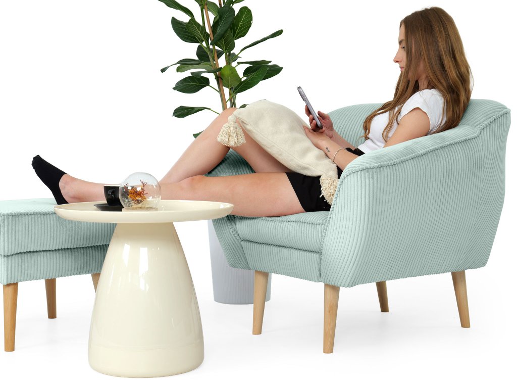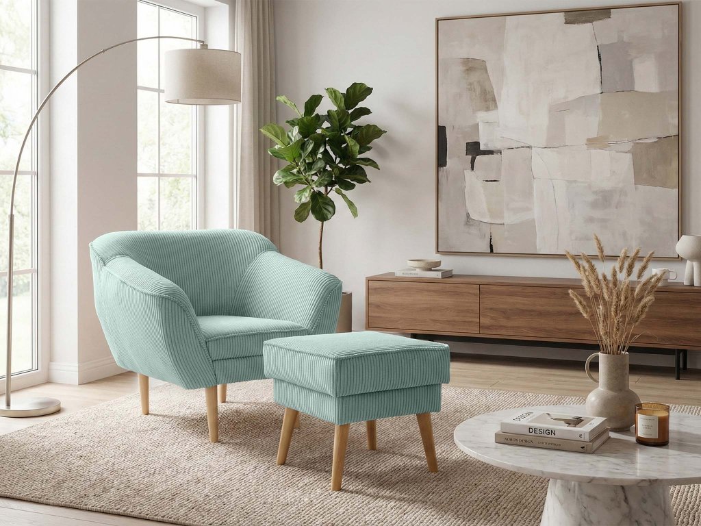 Hľadáte spôsob, ako oživiť svoj interiér a zároveň si dopriať pohodlie? Kreslo s taburetom v modernom mentolovom prevedení je ideálnou voľbou pre každého, kto obľubuje svieže a čisté farby. Táto sedacia súprava v kompaktnom rozmere vyniká zaoblenými líniami a poťahom z hrubého menčestru, ktorý je veľmi príjemný na dotyk. Mentolový odtieň vnesie do miestnosti novú energiu a pocit ľahkosti. Stabilitu zabezpečujú svetlé drevené nožičky, ktoré prirodzene dopĺňajú vzhľad kresla a hodia sa do moderných, elegantných aj škandinávsky ladených bytov.