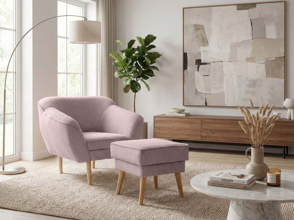 Kreslo s taburetom Dory v ružovej – štýlový kúsok, ktorý rozžiari váš domov