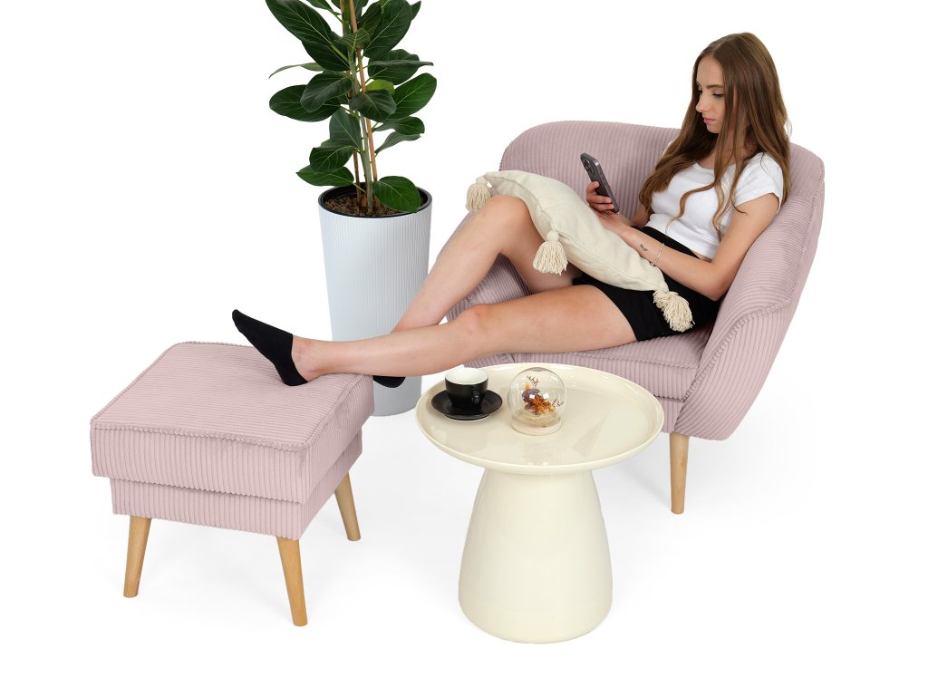 Túžite po nábytku, ktorý do vašej domácnosti vnesie nielen pohodlie, ale aj dávku charizmy? Kreslo s taburetom v očarujúcom staroružovom odtieni vytvorí v každom interiéri atmosféru hrejivého domova a moderného vkusu. Táto dizajnová ružová sedacia súprava v kompaktnej verzii stavia na kontraste jemných zaoblených línií a výraznej štruktúry menčestru, čo z nej robí vizuálny stredobod miestnosti. Pastelová ružová farba priestor príjemne zmäkčuje a dodáva mu osobitý šmrnc. Pevné nožičky z prírodného dreva podčiarkujú jej stabilitu a vnášajú do dizajnu svieži nádych, ktorý sa ľahko kombinuje s ostatným zariadením.