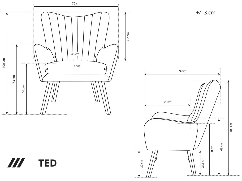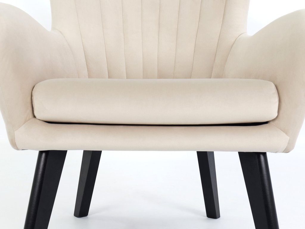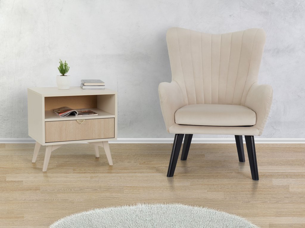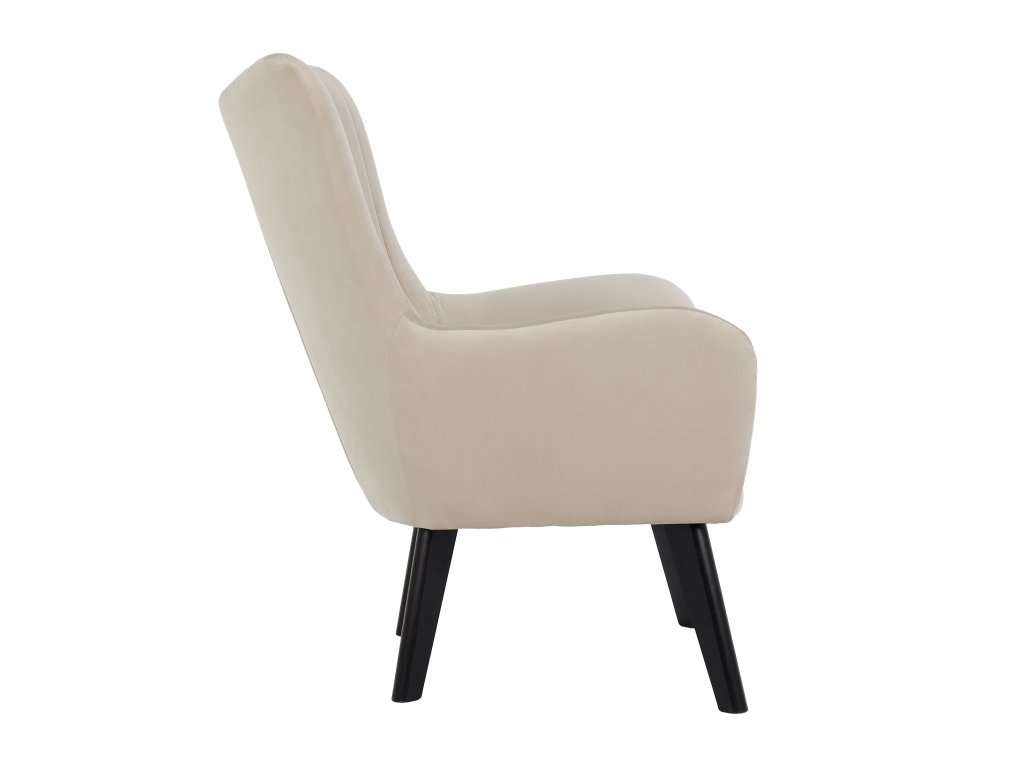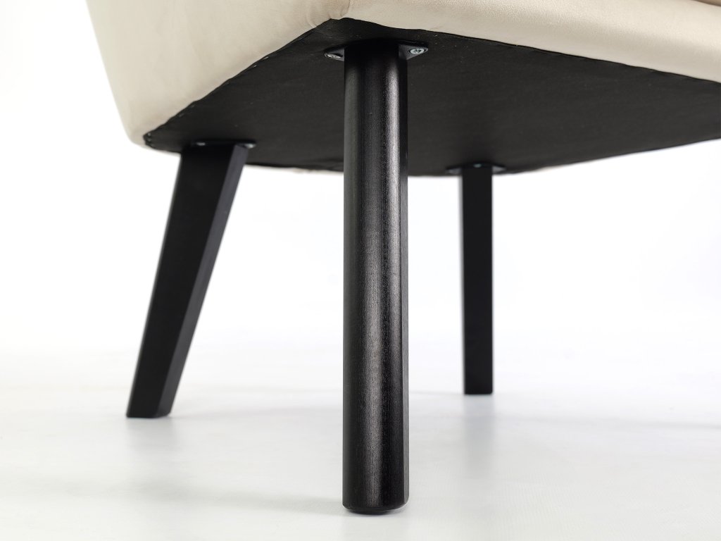 Kreslo Ted - Elegantné kreslo s béžovou farbou a vysokou kvalitou konštrukcie. Kreslo spojuje výnimočný retro dizajn s modernými vlastnosťami, ktoré ho robia ideálnym doplnkom do každej obývacej izby. Jeho béžová farba zapadne do každého interiéru a konštrukcia z preglejky a dreva dodávajú tomuto kreslu pevný a odolný základ, ktorý zabezpečí dlhodobú trvanlivosť. Čalúnenie látkou Velluto poskytuje luxusný pocit dotyku a pohodlie pri dlhých sedeniach. Sedadlo kresla je vyplnené kvalitnou PUR penou, čo prináša pohodlné a ergonomické sedenie. Krásne vysoké nohy z masívu, v čiernej farbe, dodávajú nábytku stabilitu a ešte viac retro charakteru. Tento kúsok je skvelou voľbou pre tých, ktorí hľadajú kombináciu štýlu, komfortu a odolnosti vo svojom nábytku. S kreslom Ted si môžete vychutnať nezabudnuteľné relaxačné chvíle.