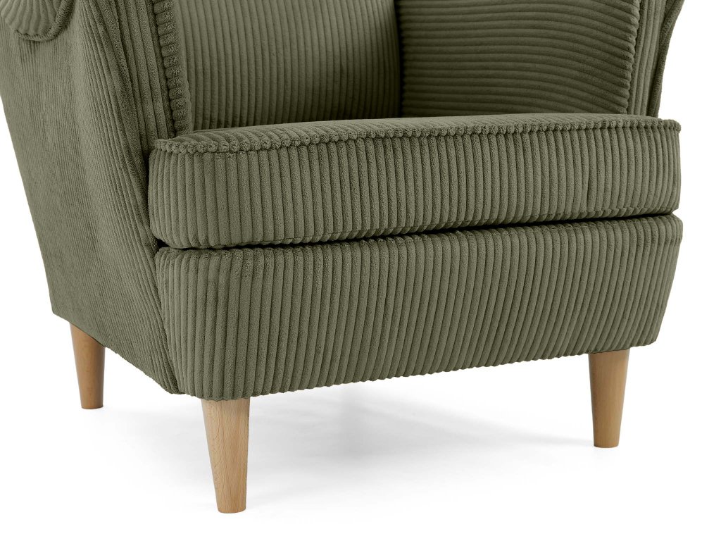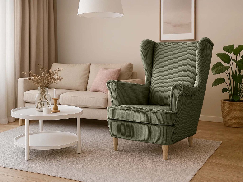 Olivové kreslo ušiak Dory – štýlový relax v prírodných tónoch