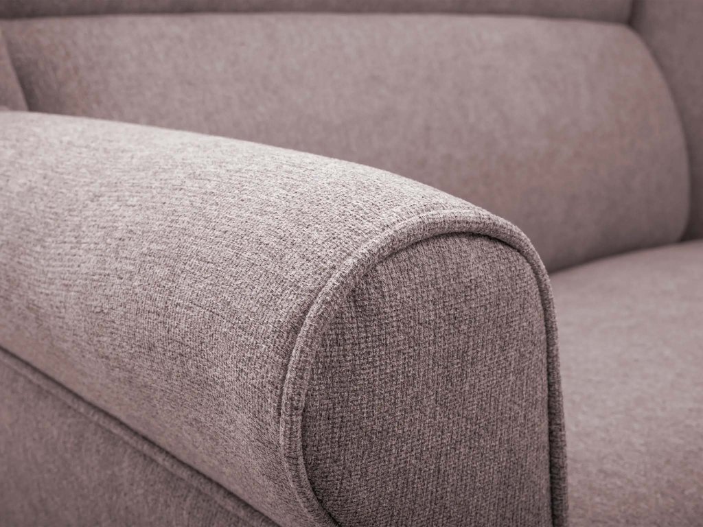 Štýlová dvojmiestna pohovka Loft II v ružovej látke so zaobleným operadlom a elegantnými drevenými nohami