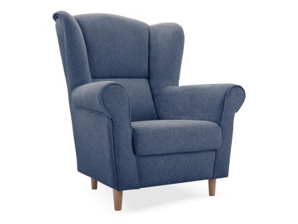 Štýlové kreslo ušiak Loft v modrej farbe s vysokým operadlom a drevenými nohami