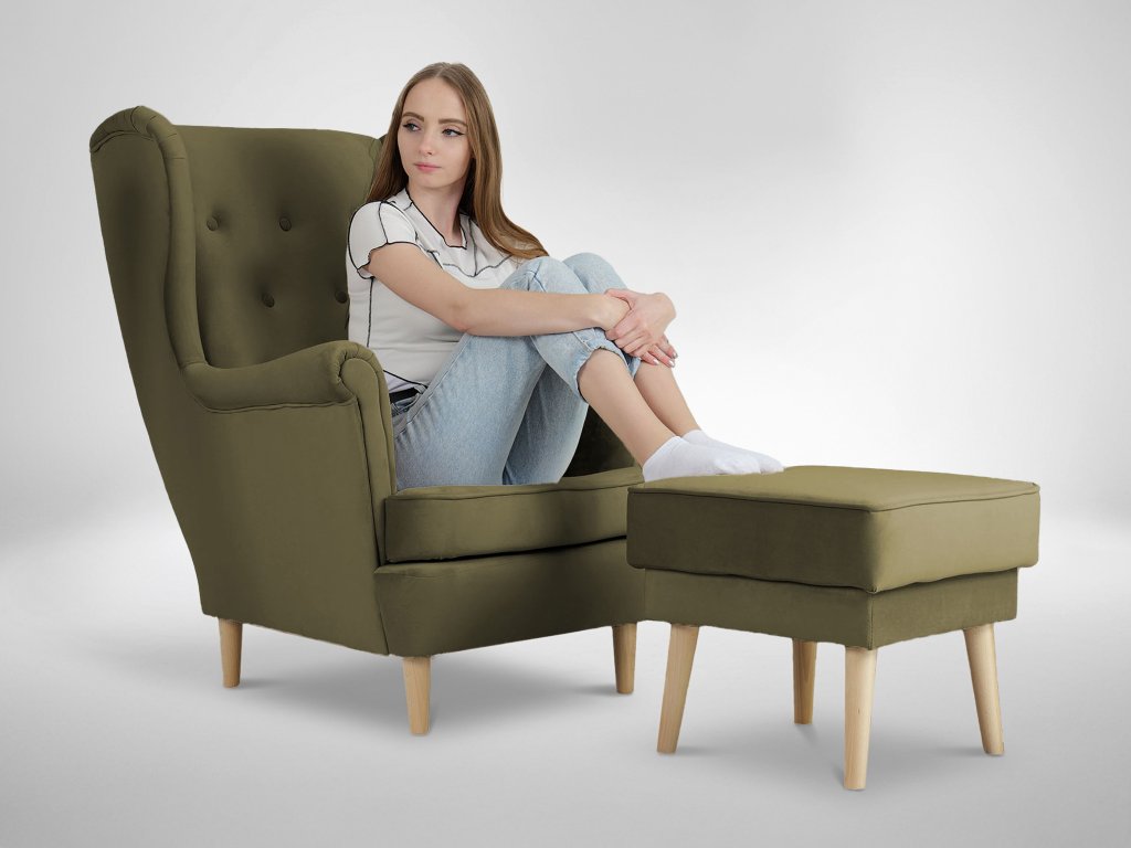 Kreslo ušiak s taburetom Deana - olivová zelená