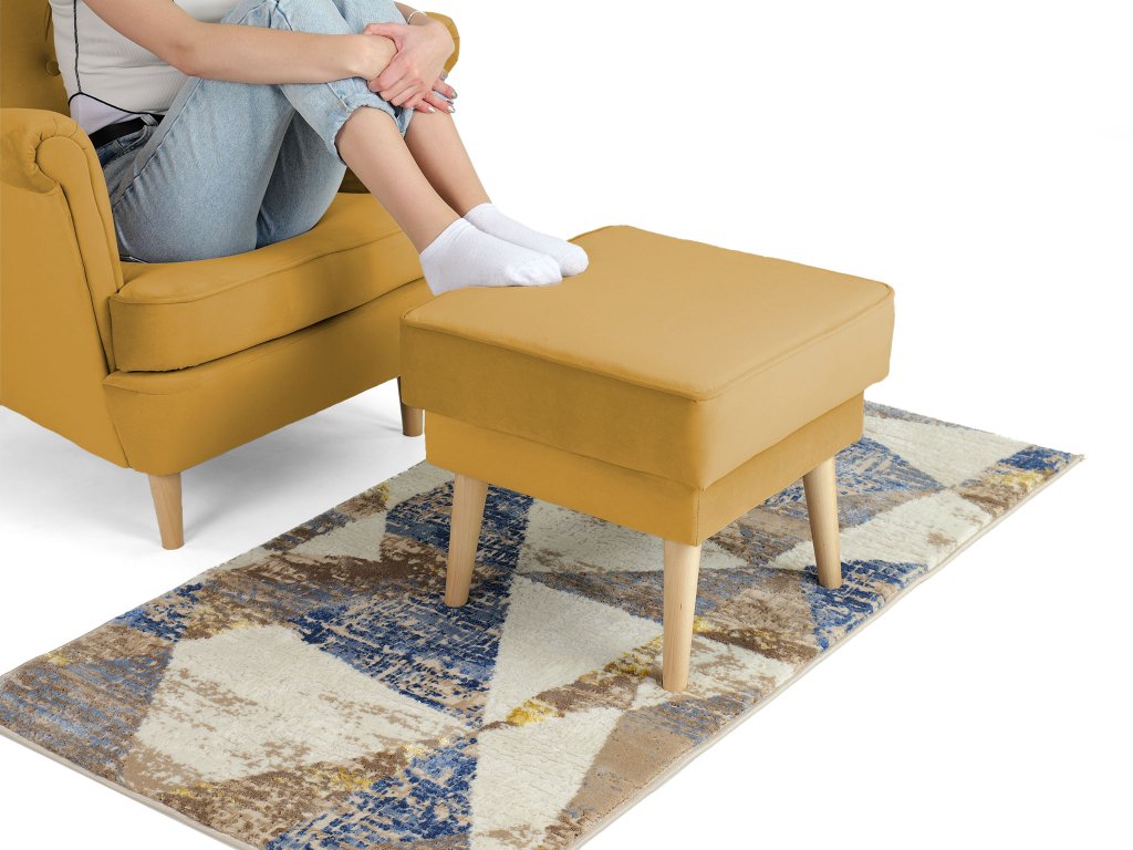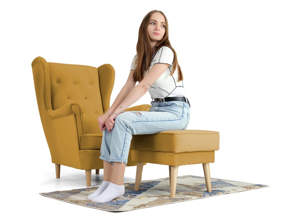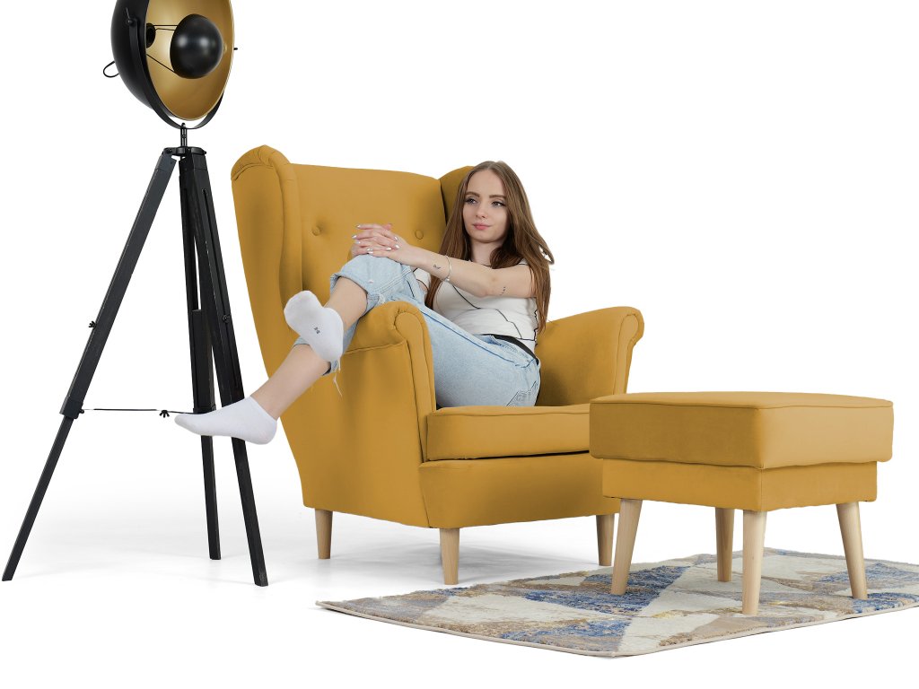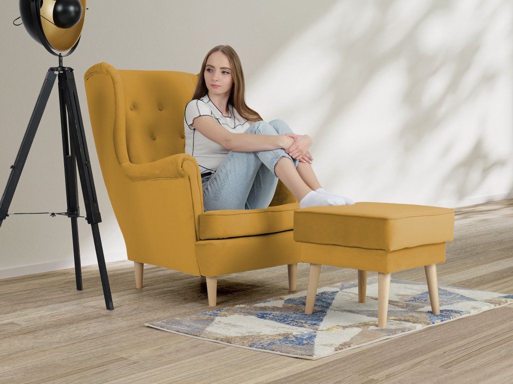 Ak túžite po pohodlnom kresle a taburete v teplom žltom odtieni, sada Deana je perfektným riešením. Čalúnenie látkou Royal zaručuje jemný pocit na dotyk a odolnosť pri každodennom používaní. Detailné prešívanie na operadle pridáva nábytku nádych elegancie, zatiaľ čo kombinácia pien T25 a T30 poskytuje výnimočný komfort. Nožičky z masívneho dreva dodávajú stabilitu a prírodný šarm. Praktickým bonusom je odnímateľný vrchný matrac ušiaka, ktorý výrazne uľahčuje starostlivosť o nábytok.