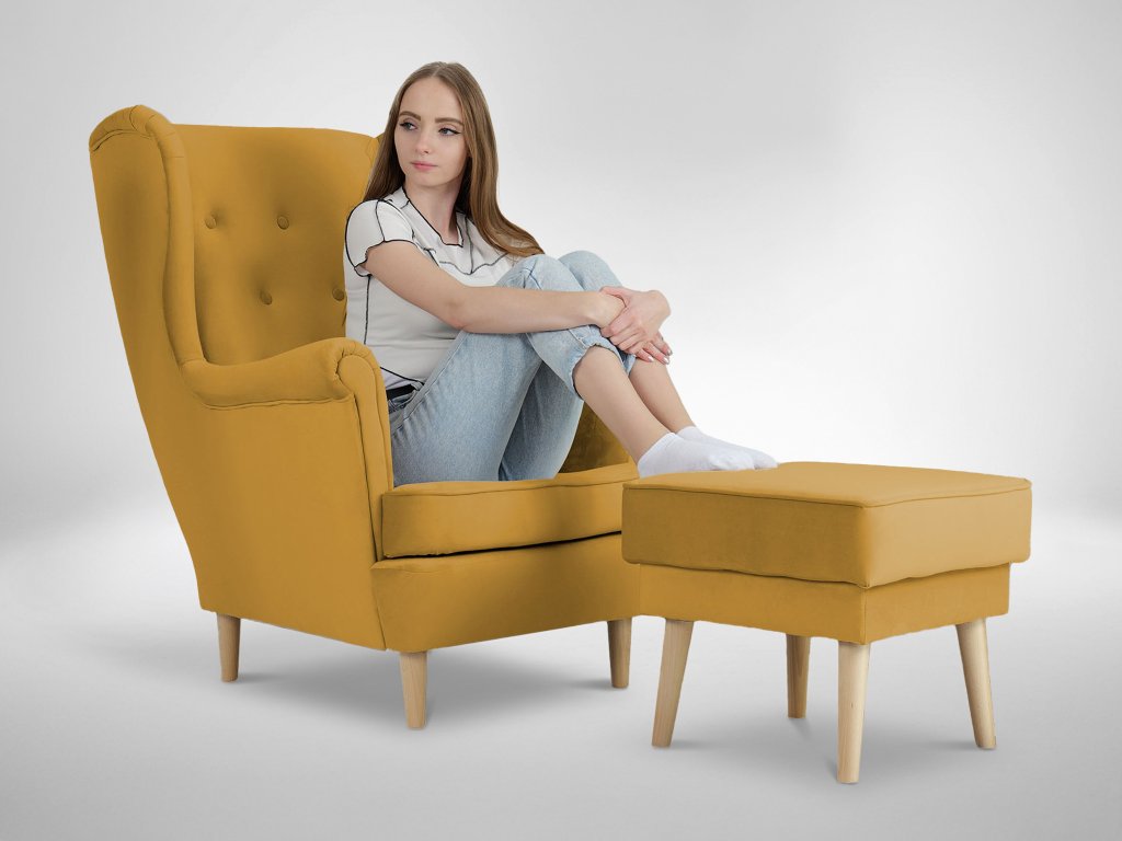 Kreslo ušiak s taburetom Deana - žltá