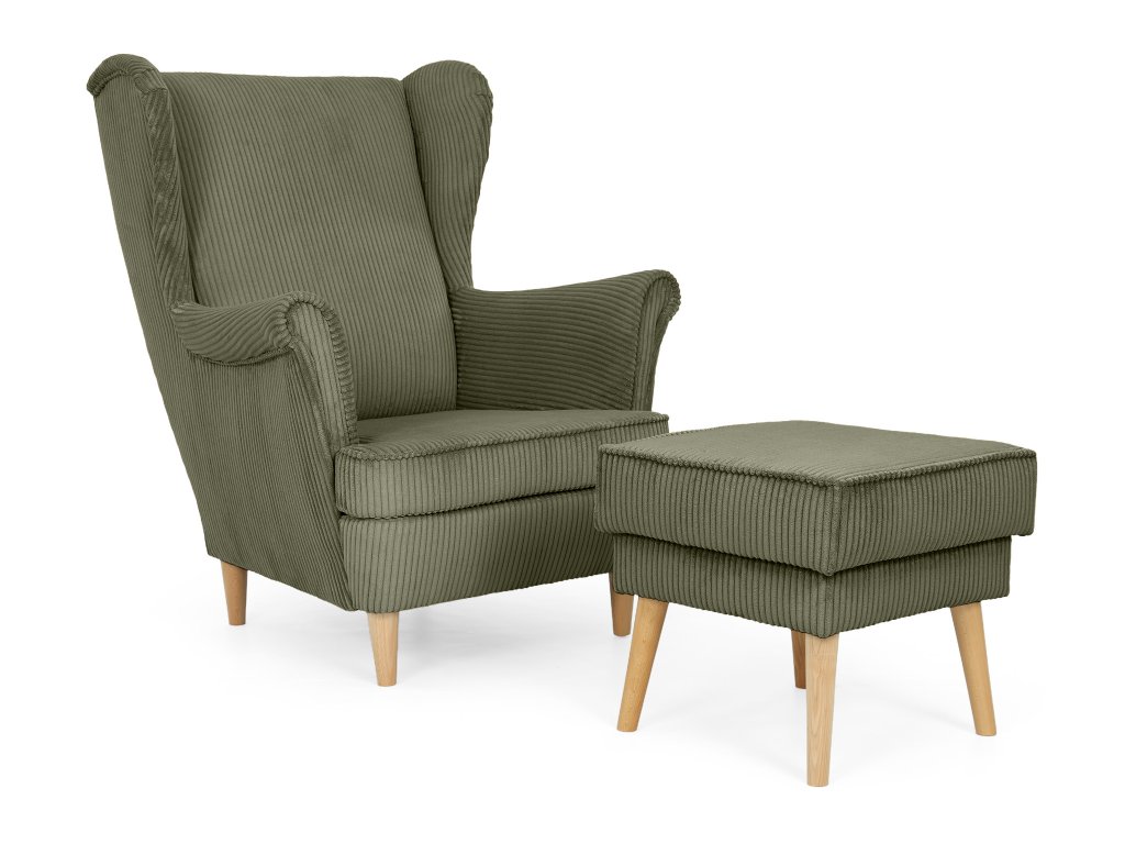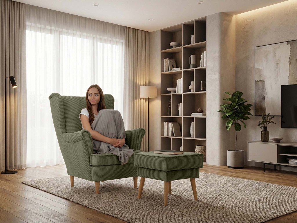 Olivové kreslo ušiak s taburetom Dory – moderný akcent pre váš súkromný relaxačný kútik