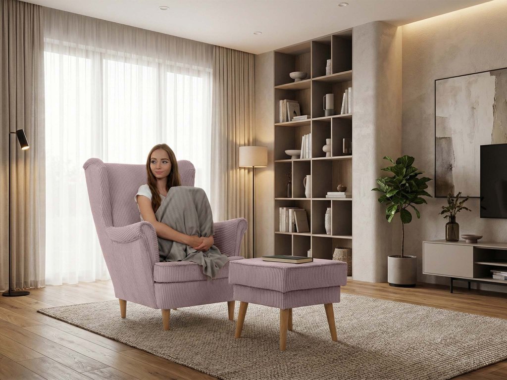Kreslo ušiak s taburetom Dory - svetloružová