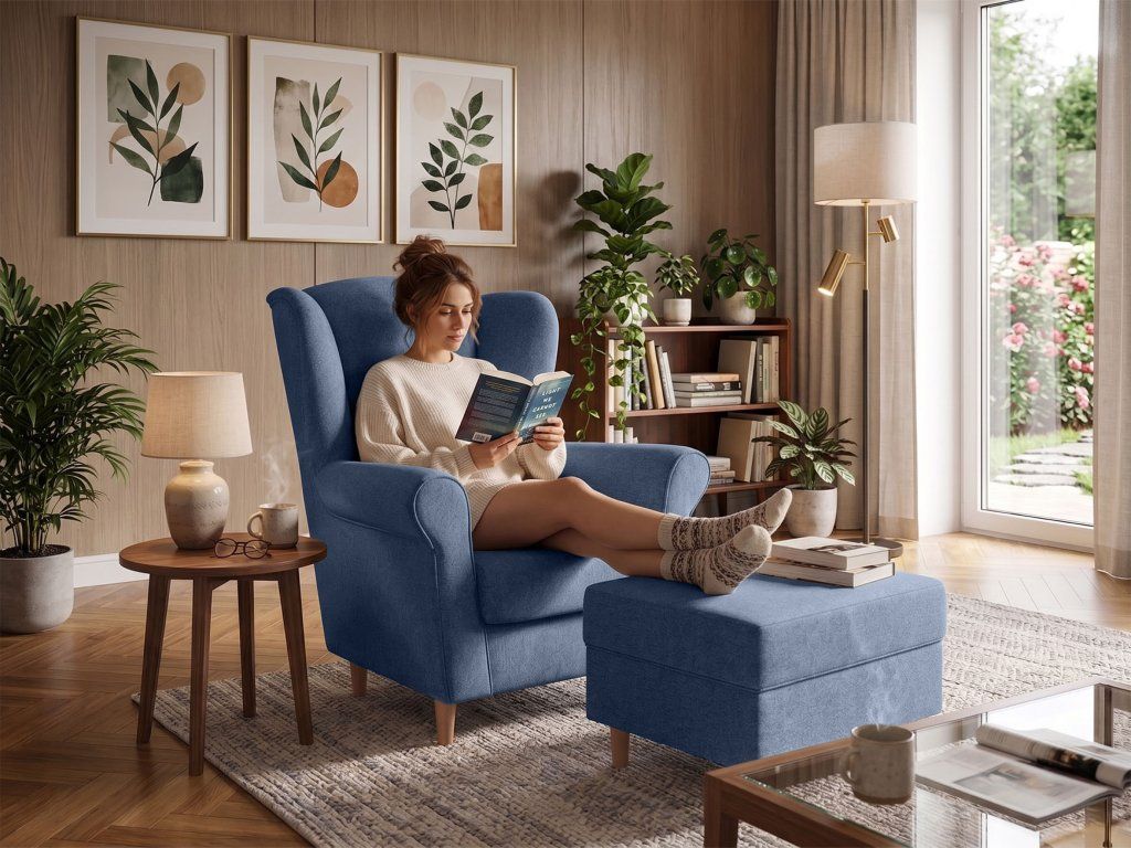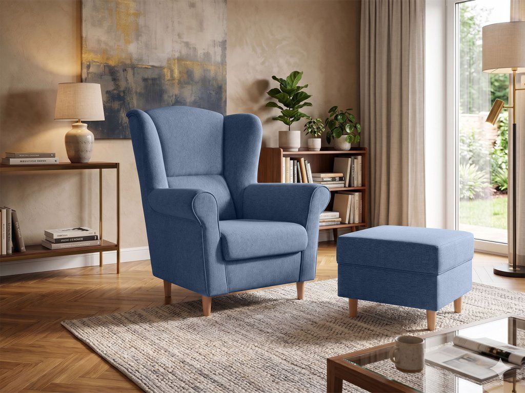 Modré kreslo ušiak Loft s taburetom – štýlový set pre pohodlný relax