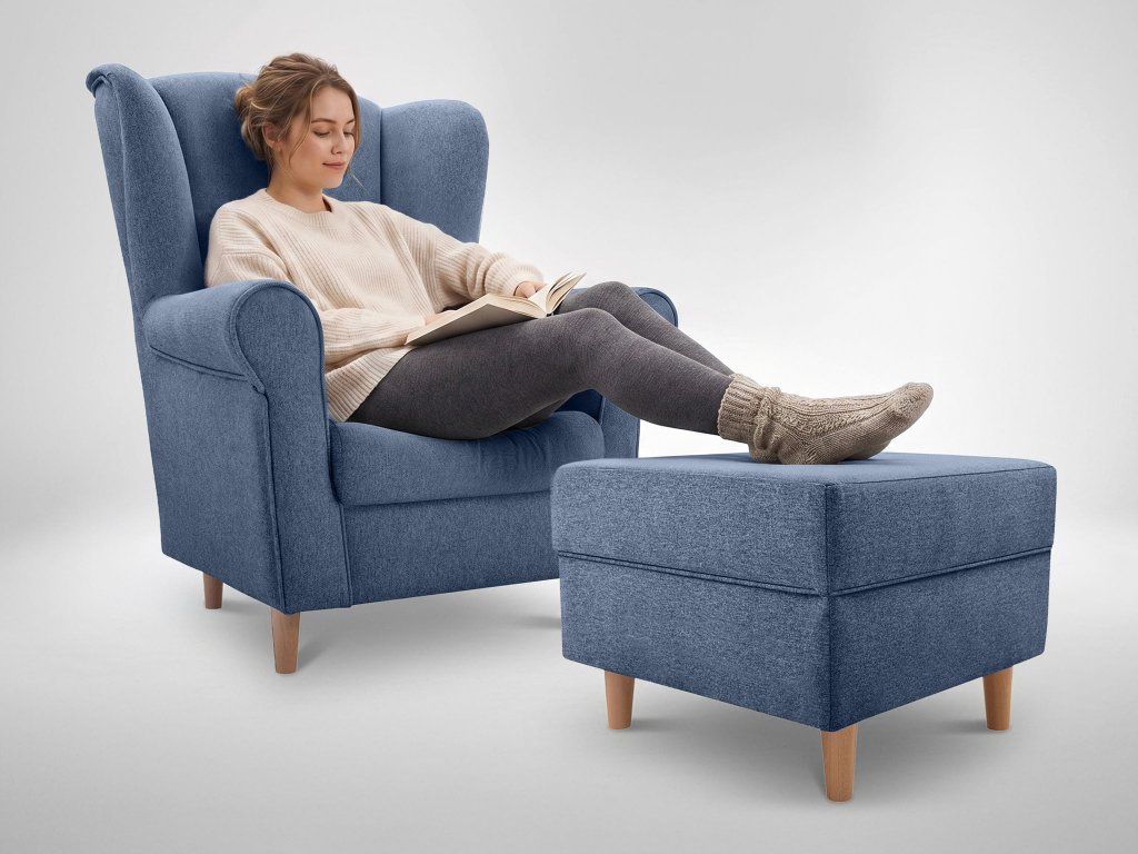 Kreslo ušiak s taburetom Loft - modrá