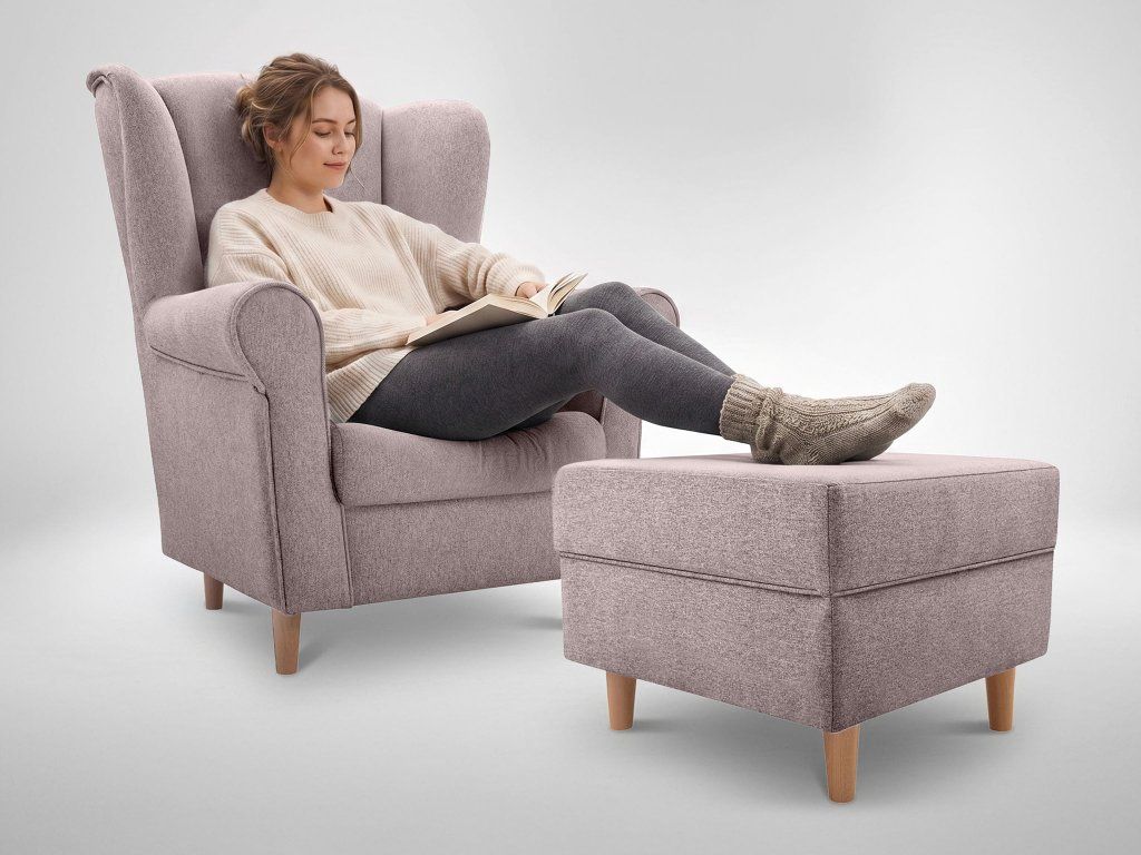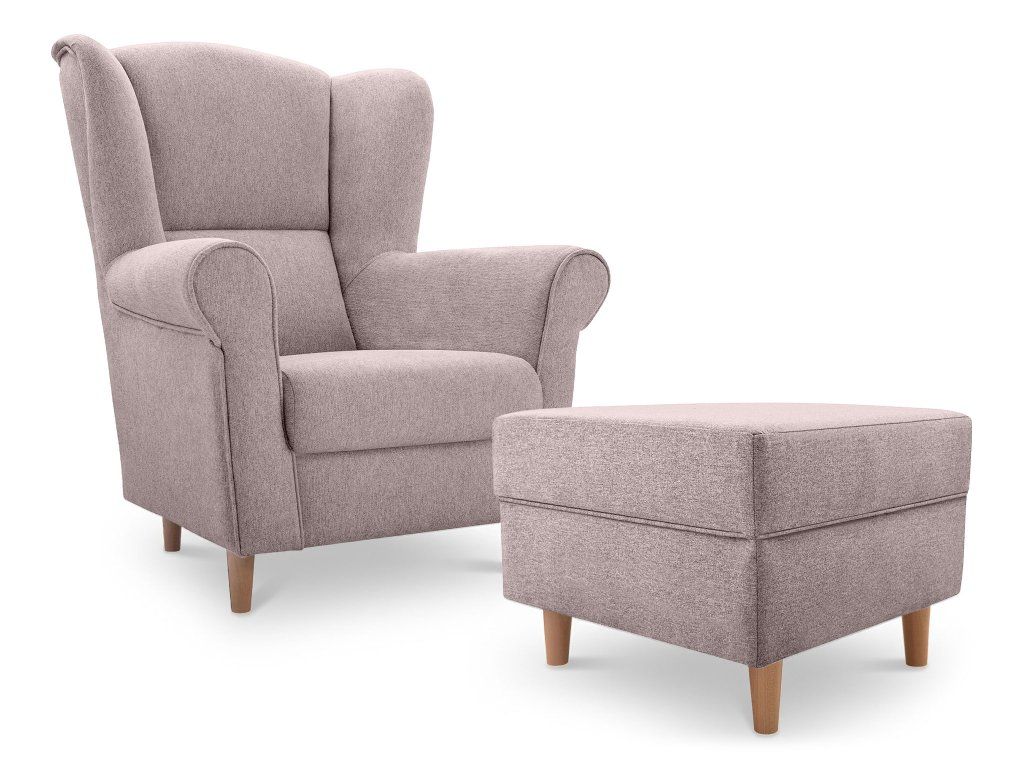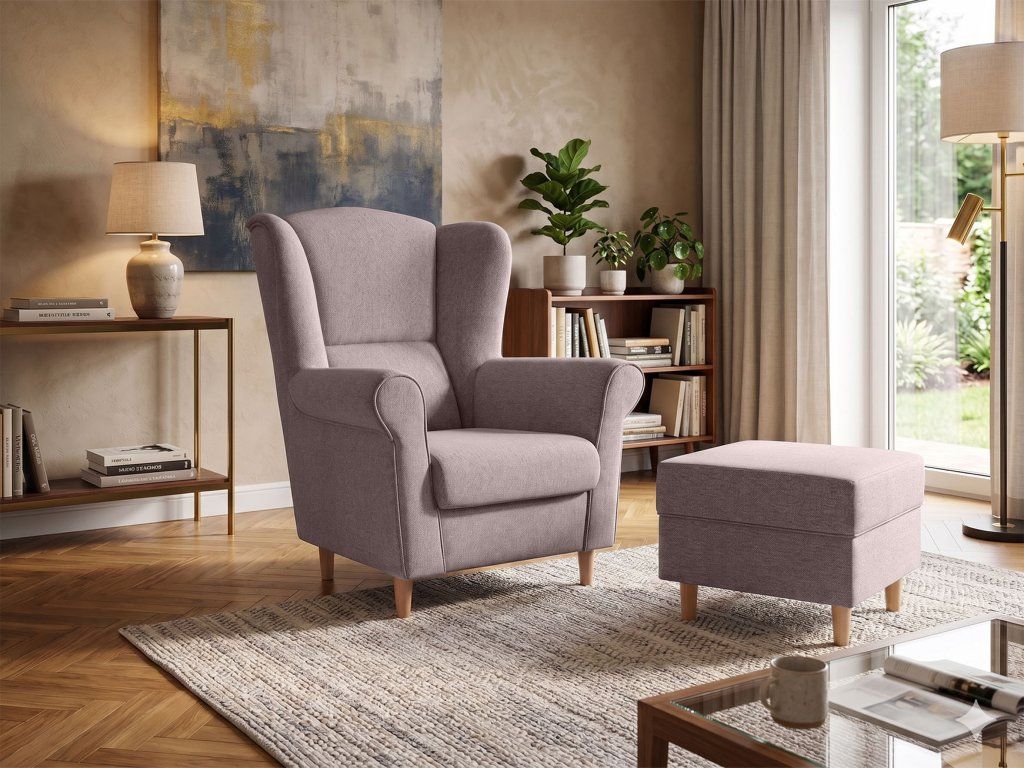 Ružové kreslo ušiak Loft s taburetom – štýlová zostava pre komfortný relax