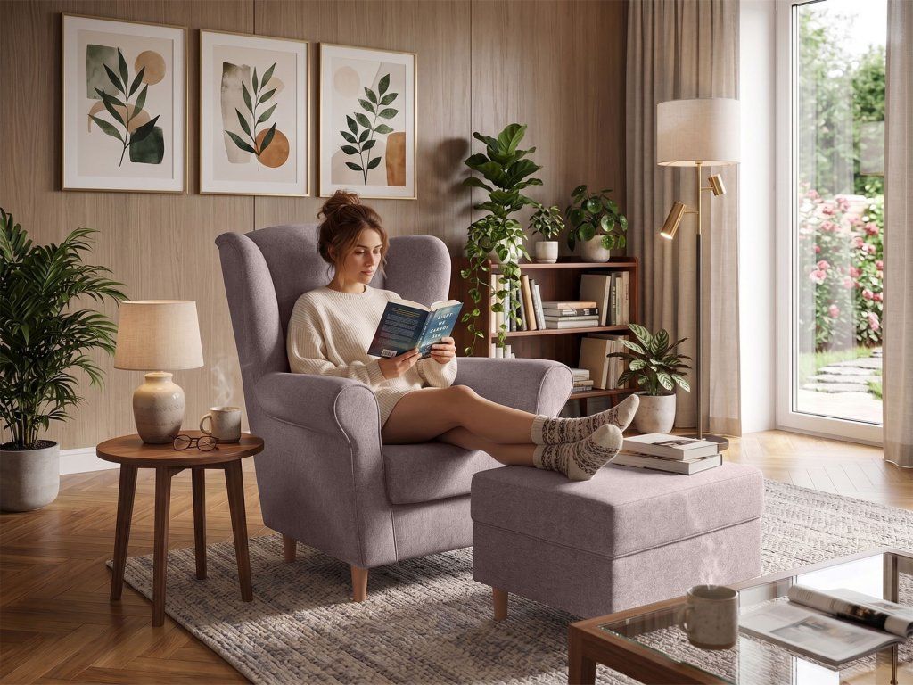 Ak si chcete vytvoriť miesto určené na skutočný oddych, kreslo ušiak Loft s taburetom je veľmi dobrá voľba. Tento set pozostáva z kresla a samostatného taburetu, ktoré spolu vytvárajú pohodlný a praktický priestor na každodenné uvoľnenie. Vysoká chrbtová opierka a typické bočné „uši“ poskytujú príjemnú podporu hlavy aj chrbta, vďaka čomu sa z tohto kresla rýchlo stane obľúbené miesto vo vašej obývačke, spálni alebo pracovni.