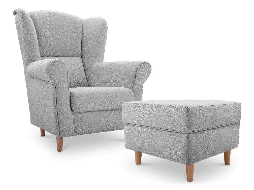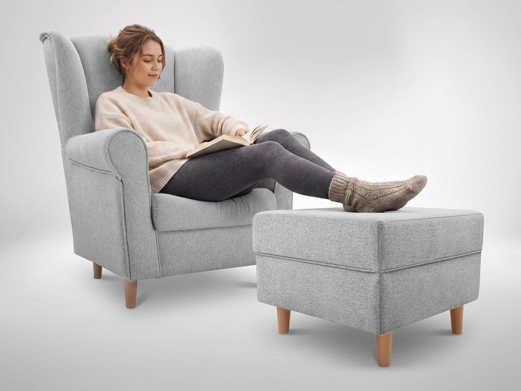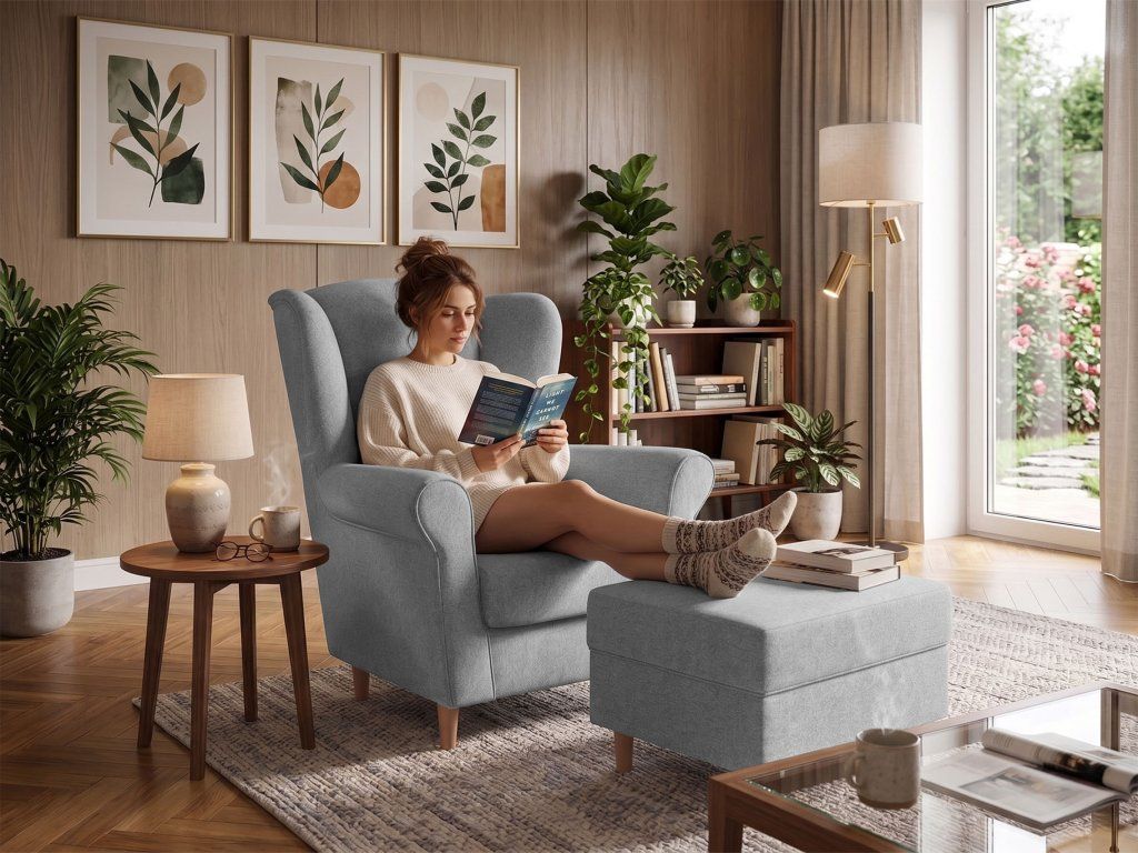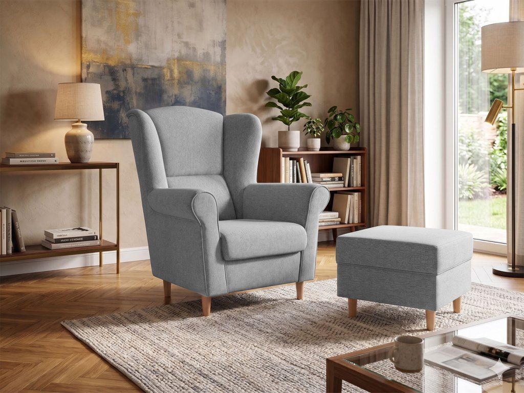 Svetlosivé kreslo ušiak Loft s taburetom – nadčasové riešenie pre pohodlné sedenie