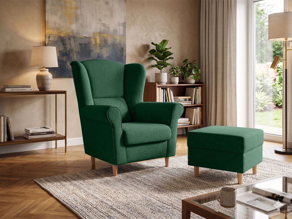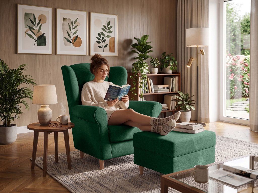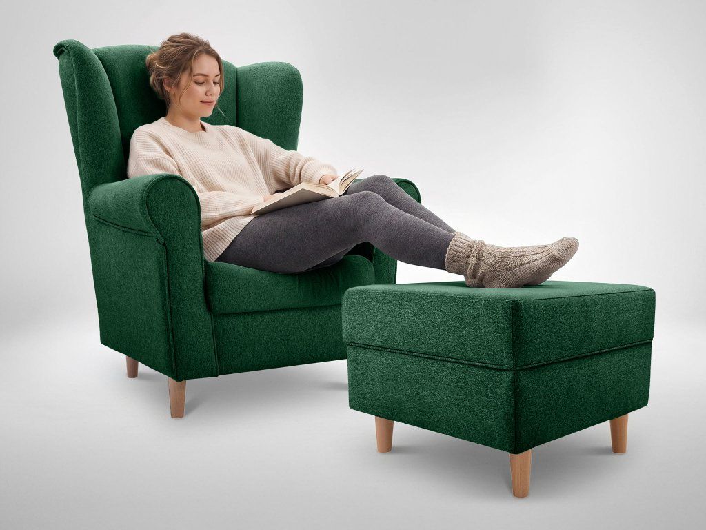 Zelené kreslo ušiak Loft s taburetom – moderný set pre pohodový relax