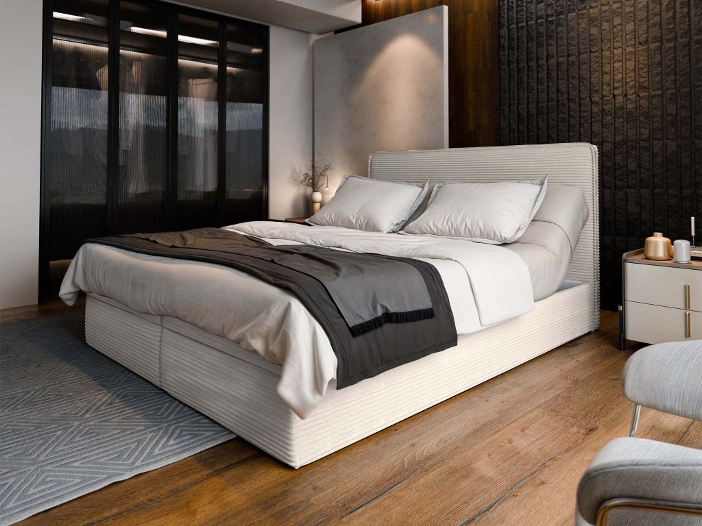 Textília Lincoln v krémovom odtieni pripomína jemný zamatový menčester so subtílnymi pruhmi a spája príjemný povrch s luxusným vzhľadom. Vďaka decentnému dizajnu sa posteľ ľahko kombinuje s ostatným nábytkom a dodá spálni pocit útulnosti.