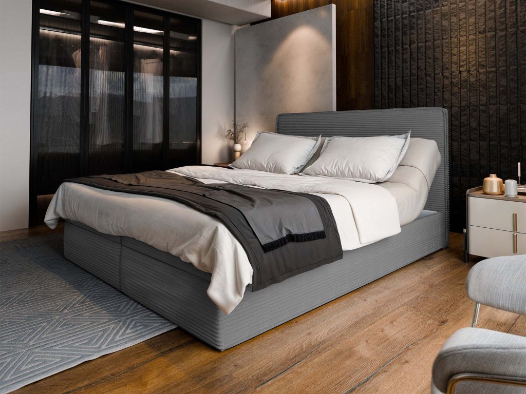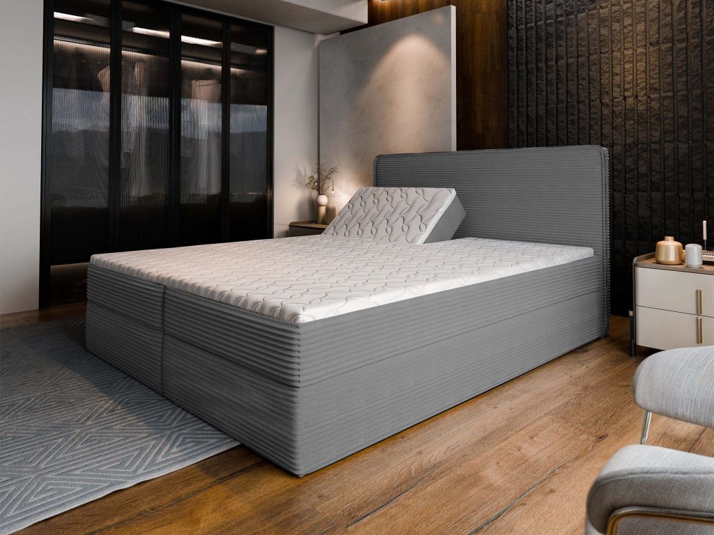 Nastaviteľná krčná časť matraca prináša flexibilitu a umožňuje individuálne prispôsobenie podľa vašich potrieb. Či už si chcete pohodlne čítať, oddychovať alebo sledovať televíziu, každá poloha je na dosah. Čalúnené vysoké čelo dodáva spálni sofistikovaný vzhľad, zatiaľ čo nízke nožičky pridávajú na stabilite. Sivé čalúnenie Lincoln s jemnou menčestrovou štruktúrou pripomínajúcou zamat dopĺňa štýlový a harmonický interiér.