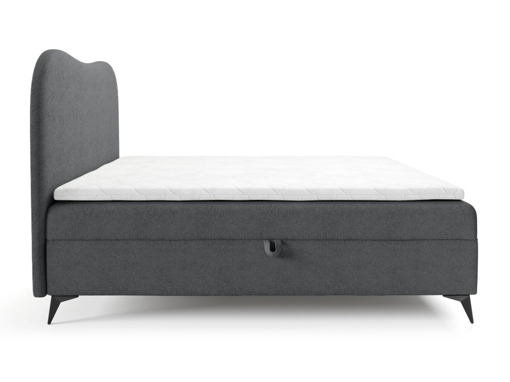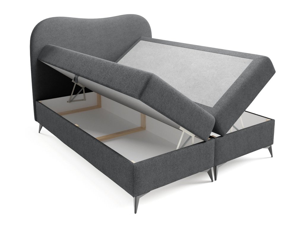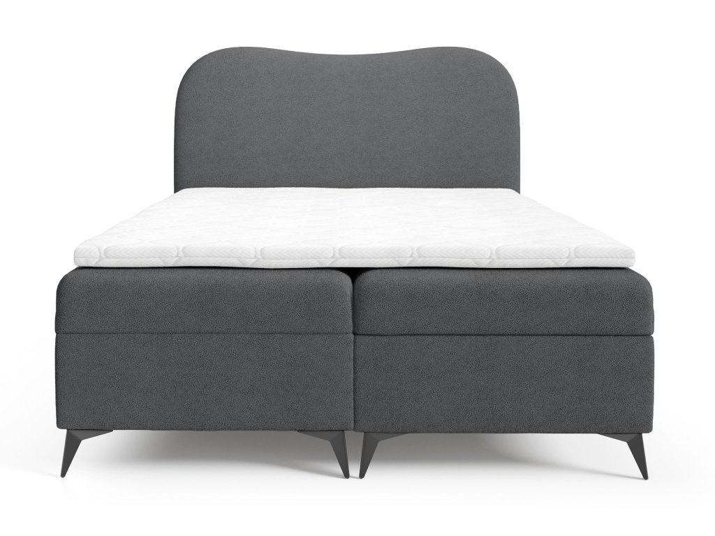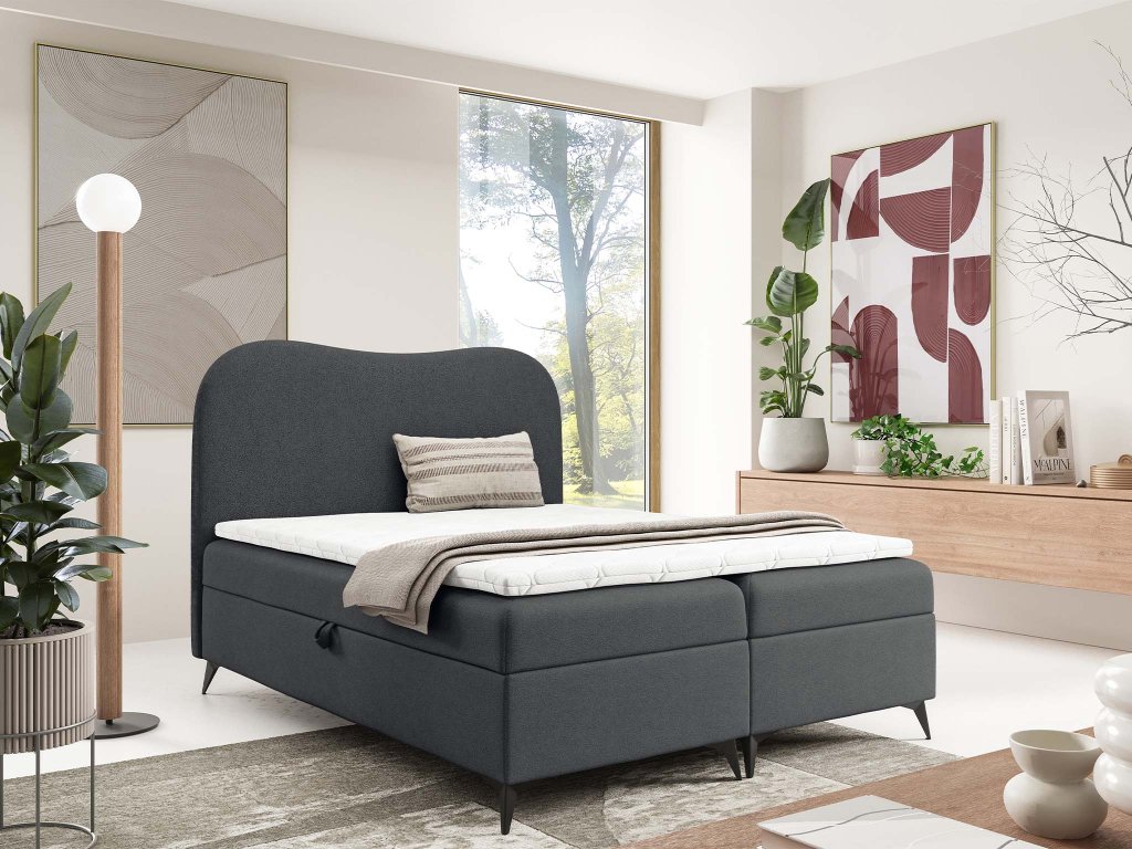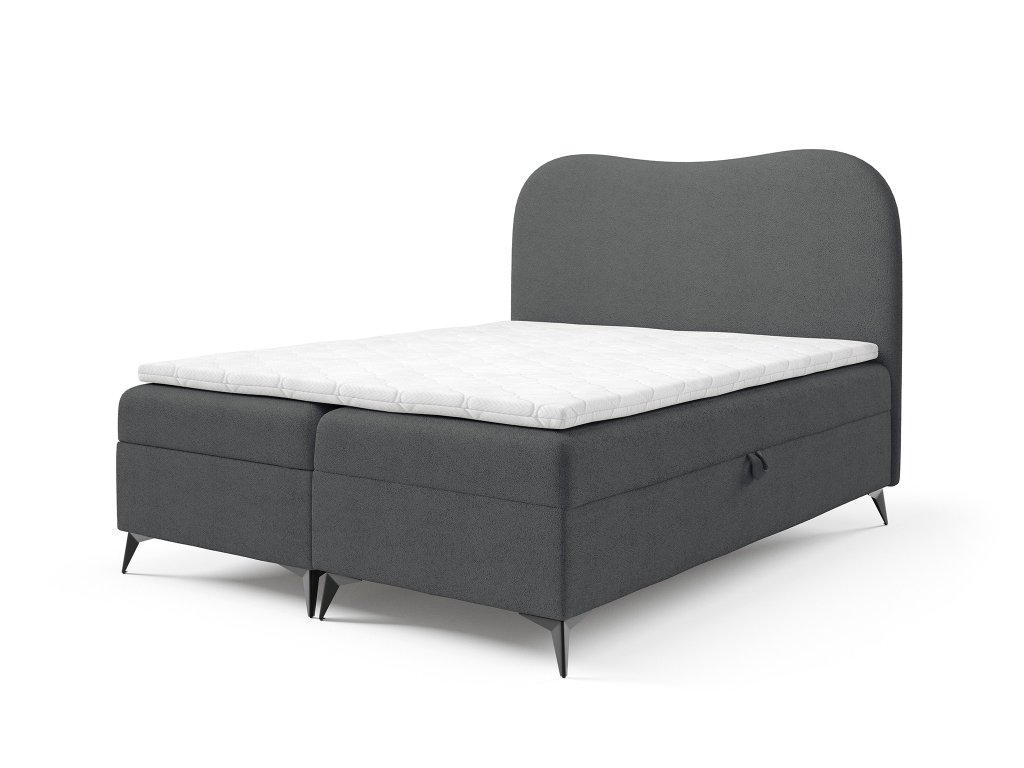 Okrem dvoch priestranných úložných boxov, ktoré sa hodia na uskladnenie prikrývok, vankúše či sezónneho oblečenia, je čalúnená posteľ vybavená aj pružinovým mechanizmom, ktorý uľahčí prístup k uloženým veciam. Stabilitu postele zabezpečujú čierne kovové nožičky, ktoré zároveň dotvárajú kontrast s jemným čalúnením.