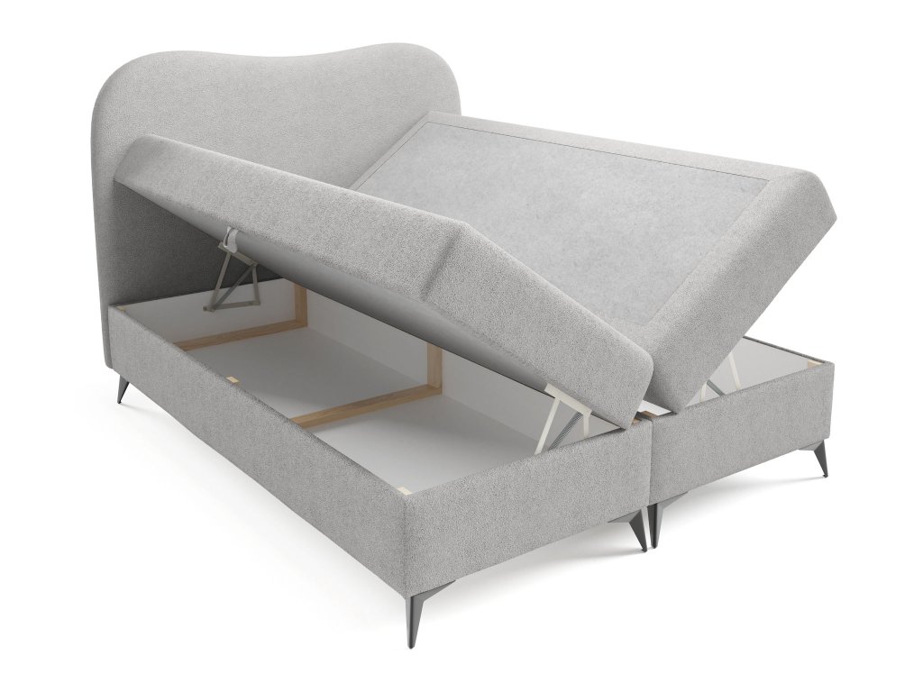 Výhodou postele je aj praktický úložný priestor, ktorý ukrýva dva veľké úložné boxy, praktické na odloženie napríklad perín, vankúšov či sezónneho oblečenia. Pružinový systém otvárania uľahčuje prístup k obsahu a čierne kovové nožičky nielen spevňujú konštrukciu, ale zároveň vytvárajú elegantný kontrast s jemným čalúnením.