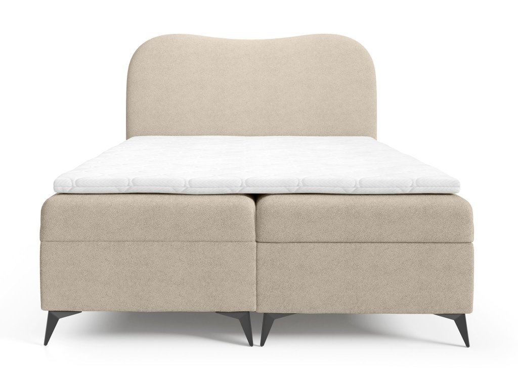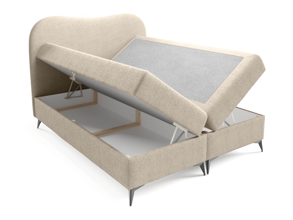 Ambra ponúka aj praktickú stránku – dva objemné úložné boxy na posteľnú bielizeň či sezónne doplnky. Ich otváranie je jednoduché vďaka pružinovému mechanizmu. Stabilitu konštrukcie zaisťujú čierne kovové nohy, ktoré zároveň vytvárajú moderný kontrast s jemným čalúnením.