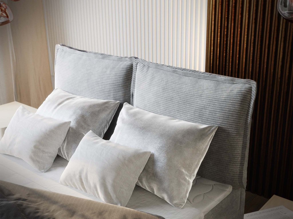 Dizajnový charakter postele podčiarkuje menčestrový poťah Lincoln v elegantnom svetlosivom odtieni. Táto látka s jemnou textúrou je vysoko odolná voči oderu, zachováva si svoju farbu aj pri dlhodobom pôsobení slnka a spĺňa požiadavky nehorľavosti. Kvôli jej štruktúre však nemusí byť vhodná do domácností so zvieratami. Výrazným prvkom je vysoké čelo v tvare mäkkého vankúša, ktoré poskytuje pohodlnú oporu pri čítaní alebo relaxe a dodáva posteli útulný vzhľad.