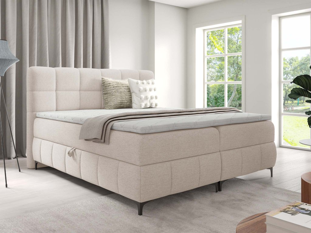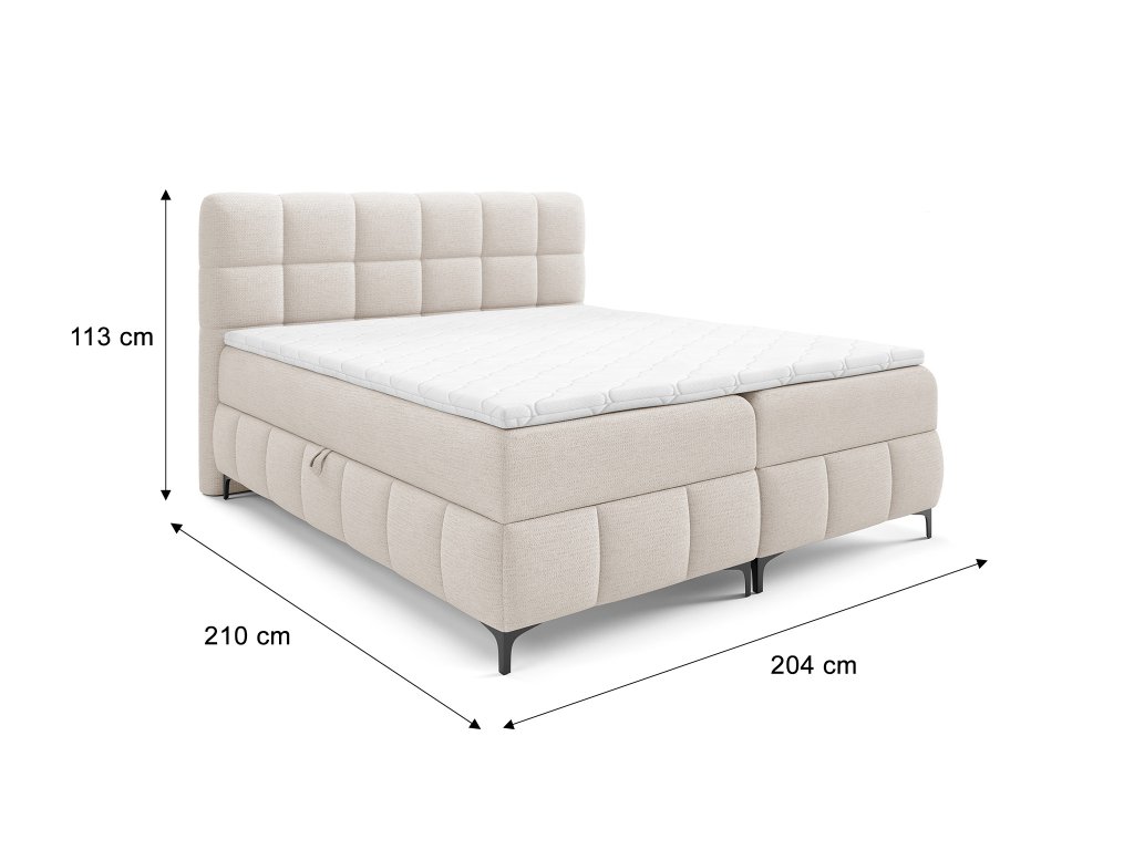 Manželská boxspring posteľ Zophie 200×200 cm je navrhnutá tak, aby priniesla do vašej spálne maximálne pohodlie a zároveň estetický vzhľad. Vďaka kvalitnému matracu s pružinami Bonnell, ktorý rovnomerne rozkladá hmotnosť a poskytuje telu stabilnú oporu, si užijete zdravý spánok bez kompromisov. Dopĺňa ju 4 cm vysoký topper z peny T-25, ktorý pridáva lôžku jemnú mäkkosť a zvyšuje komfort pri každodennom používaní. Manželská posteľ ukrýva aj priestranný úložný priestor na periny či obliečky, ktorý otvoríte jednoducho pomocou praktického pružinového mechanizmu.