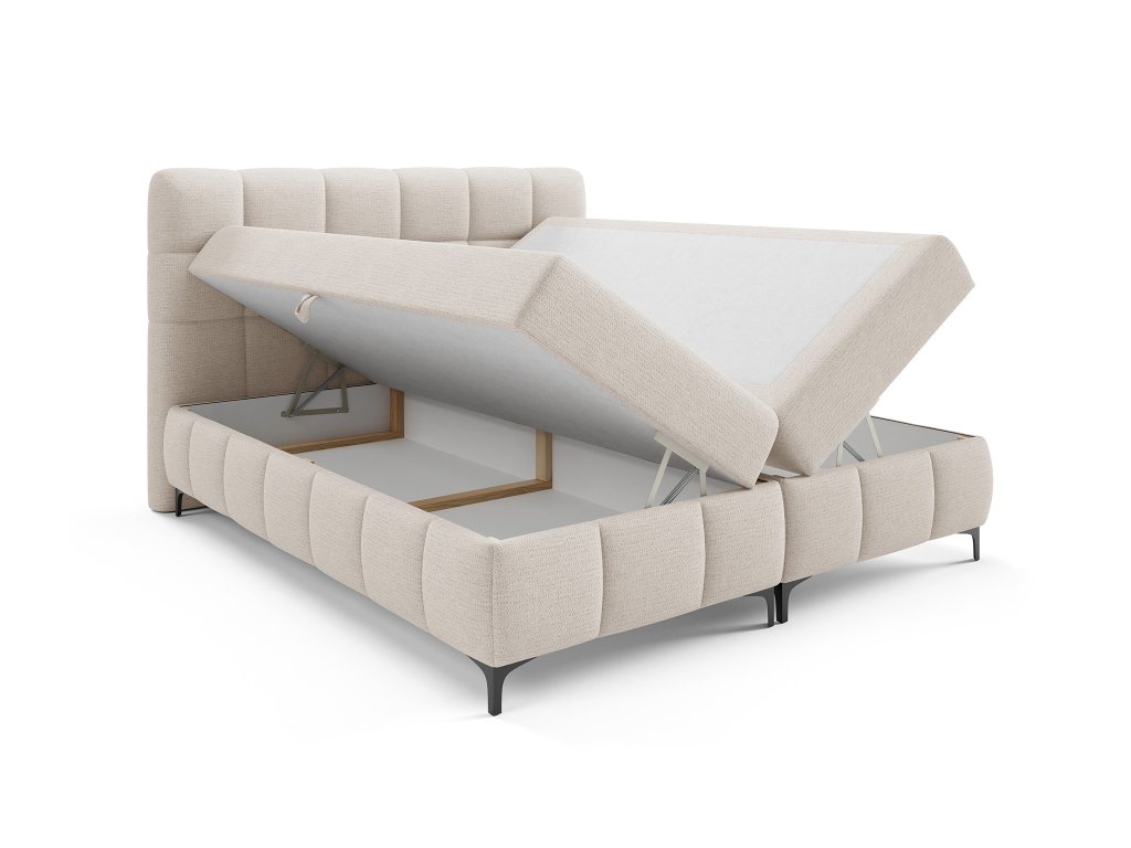 Čalúnenie postele tvorí prvotriedna látka Aragon, ktorá je stálofarebná a odolná voči svetlu, treniu, žmolkovaniu aj škvrnám. Vďaka týmto vlastnostiam si čalúnená posteľ zachová atraktívny vzhľad po dlhé roky. Konštrukciu podopierajú pevné čierne kovové nohy, ktoré zaručujú stabilitu a zároveň zvýrazňujú moderný štýl nábytku. Dekoratívne prešívanie na čele postele pridáva interiéru nádych luxusu a elegancie. Celkový dizajn dotvárajú matrace čiastočne potiahnuté látkou, čo vytvára harmonický a premyslený celok.
