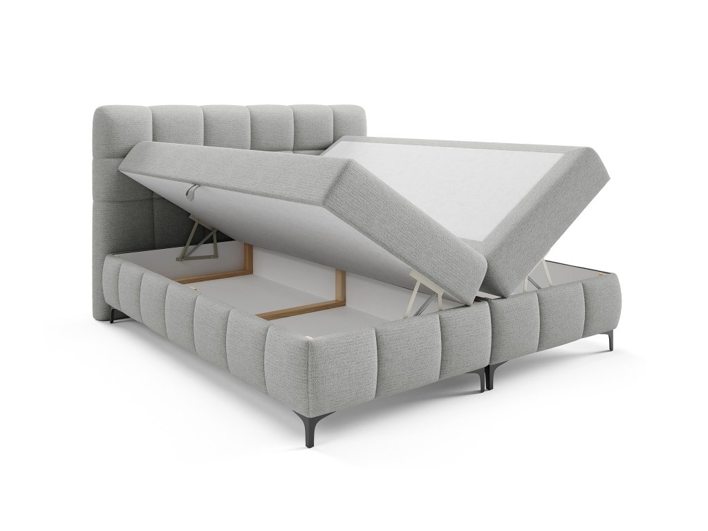 Manželská posteľ Zophie v jemnom svetlosivom prevedení prinesie do vašej spálne štýl a funkčnosť v jednom. Do spodnej časti rámu je zakomponovaný objemný úložný box, ideálny na odkladanie prikrývok, posteľnej bielizne alebo vankúšov. Vďaka pružinovému mechanizmu sa priestor otvára rýchlo a pohodlne. O pevnú stabilitu sa postarajú čierne kovové nohy, zatiaľ čo čalúnené čelo s prešívaním podčiarkuje moderný a vkusný vzhľad postele.
