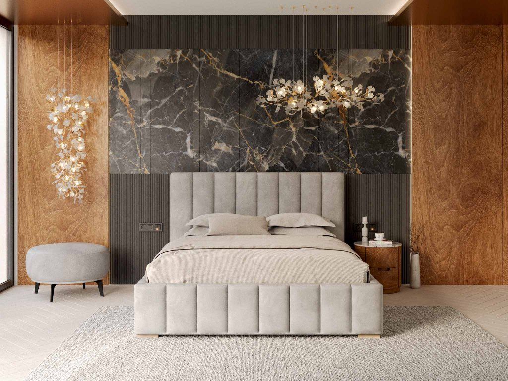 Elegantná sivá čalúnená posteľ Austin 160x200 je ideálnym riešením pre každého, kto hľadá kombináciu komfortu, úložného priestoru a nadčasového dizajnu. Jej vysoké čelo s prešívaním a látka Trinity dodajú spálni moderný vzhľad.
