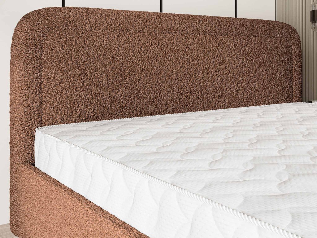 Dominantou postele je vysoké čelo so štruktúrovaným prešívaním, ktoré pôsobí mimoriadne štýlovo a zároveň útulne. Je navrhnuté tak, aby nielen zaujalo na pohľad, ale aj poskytlo pevnú a pohodlnú oporu pri večernom relaxe, čítaní knihy alebo sledovaní obľúbeného seriálu. Vďaka svojmu ergonomickému tvarovaniu podporuje zdravé sedenie a dodáva celej posteli luxusný nádych.