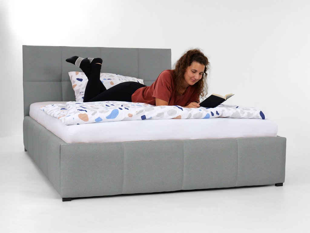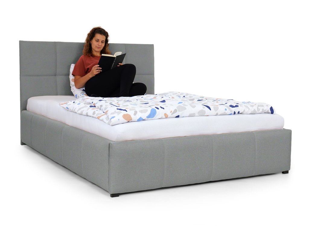 Mäkké čalúnenie príjemné na dotyk zaručuje pohodlie pri každom kontakte, zatiaľ čo vysoké čelo slúži ako praktická opora pri čítaní alebo večernom relaxe. Posteľ ukrýva aj priestranný úložný priestor, ľahko prístupný vďaka kovovému roštu so zdvíhacím mechanizmom – ideálny na uskladnenie lôžkovín či sezónnych vecí.