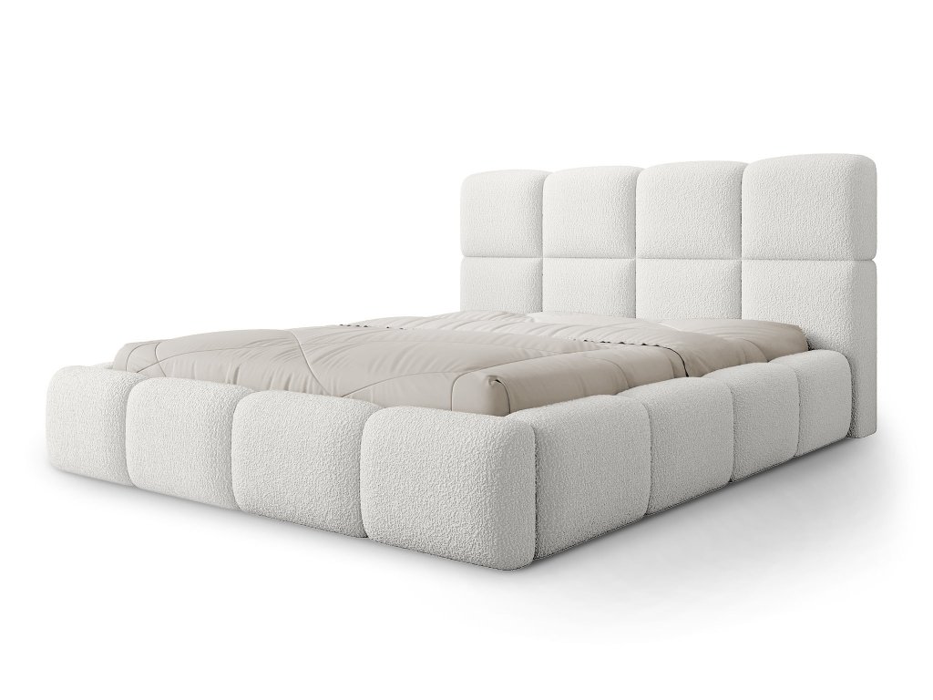 Čalúnenie z látky Quelle zaujme svojou jedinečnou buklé textúrou, ktorá pripomína hebké baránkové vlákno. V bielom odtieni pôsobí elegantne, luxusne a opticky zjemňuje celý interiér. Materiál vyniká vysokou odolnosťou voči oderu a zároveň zostáva mäkký a príjemný na dotyk. Vďaka tomu sa moderná čalúnená posteľ Deriva stane dominantou každej spálne a miestom, kam sa budete radi vracať.