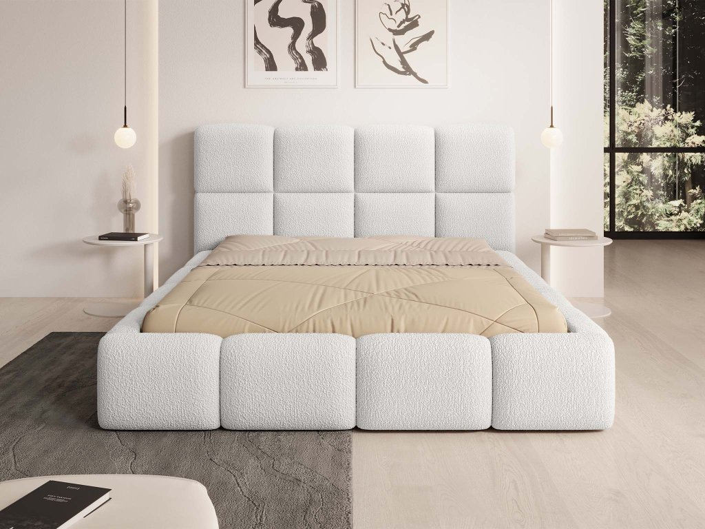 Deriva – moderná biela čalúnená manželská posteľ s úložným priestorom
