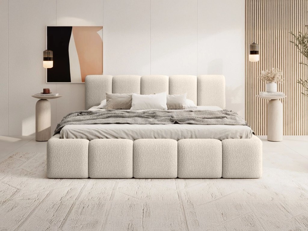 Posteľ Feros 160×200 cm v smotanovej buklé látke vnáša do spálne jemnosť, štýl a komfort. Elegantné zaoblené línie a vysoké čalúnené čelo dodávajú miestnosti výnimočný charakter a poskytujú ideálne miesto na oddych či čítanie.