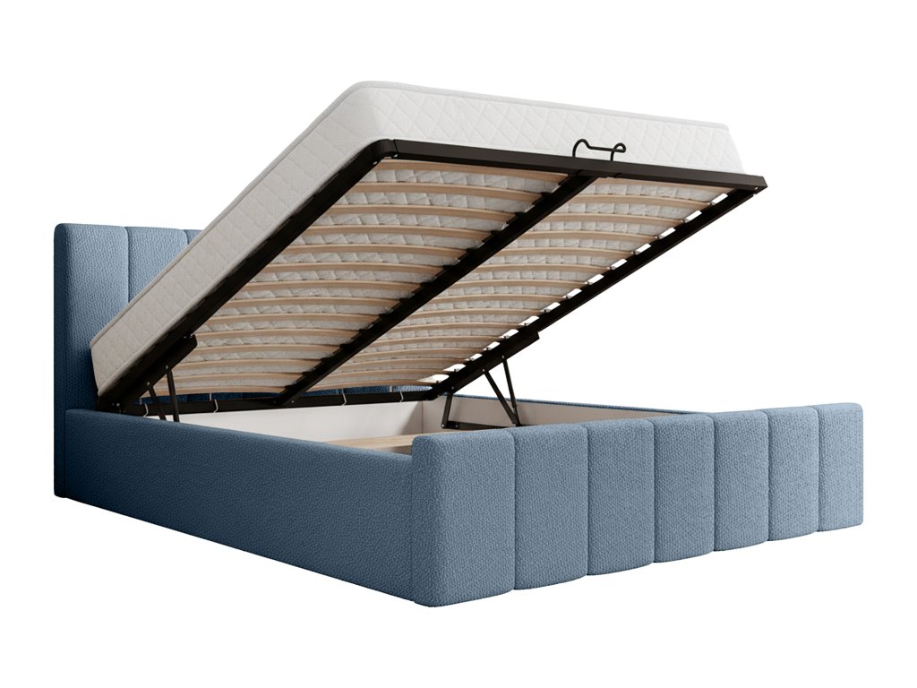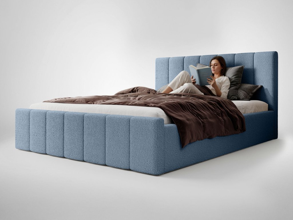 Poťahová látka Abriamo v modrom prevedení ešte viac ukazuje svoj charakter – jej tkaná štruktúra hrá drobnými odleskami a dodáva posteli exkluzívny vzhľad. Látka je trvácna, drží tvar a je ideálna pre vysoké zaťaženie. V spojení so stabilnou konštrukciou vytvára celok, ktorý je nielen estetický, ale aj praktický. Úložný priestor otváraný kovovým roštom s plynovými piestami poskytuje veľa miesta na uskladnenie vecí.