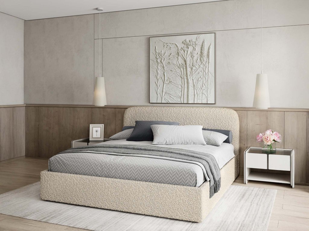 Prémiová látka Quelle je charakteristická svojou jemnou a nadýchanou „baránčekovou“ štruktúrou, ktorá dodáva nábytku jedinečný vzhľad. V béžovom prevedení pôsobí decentne a elegantne, pričom krásne ladí s tmavšími aj svetlejšími doplnkami. Textília si zachováva svoj vzhľad aj pri každodennom používaní, keďže je odolná voči oderu. Čalúnená posteľ Renive Q v béžovej farbe tak predstavuje kombináciu štýlu a funkčnosti, ktorú oceníte každý deň. Je ideálnym základom pre tvorbu útulnej a vkusnej spálne.