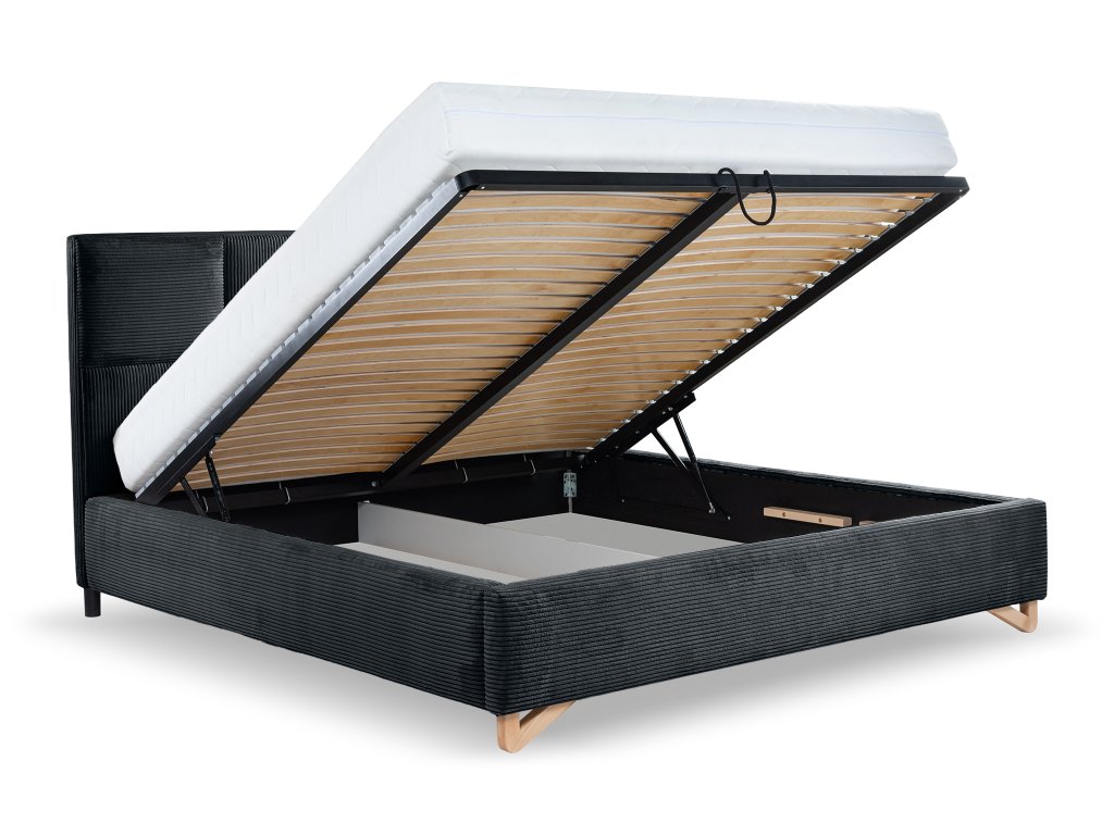 Výklopný kovový rošt umožňuje jednoduchý prístup do úložného priestoru, ktorý je ideálny na uloženie prikrývok, posteľnej bielizne alebo sezónnych textílií. Stabilitu celej konštrukcie podporujú predné bukové nožičky, ktoré dopĺňajú pevný rám postele. Vďaka kombinácii kvalitných materiálov ide o kvalitnú manželskú posteľ, ktorá je pripravená na každodenné používanie.