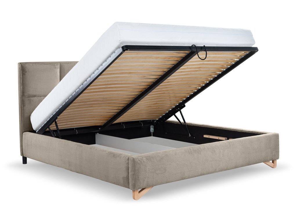 Jedinečnou výhodou manželskej postele s úložným priestorom Sofira je jej výklopný rošt, ktorý umožňuje jednoduchý prístup k úložnému priestoru. Môžete sem ukladať vankúše, prikrývky alebo posteľnú bielizeň. Predné bukové nožičky zvyšujú stabilitu a dopĺňajú elegantný vzhľad postele. Konštrukcia z laminovanej dosky, dreva a drevotriesky zaručuje pevnosť a dlhú životnosť.