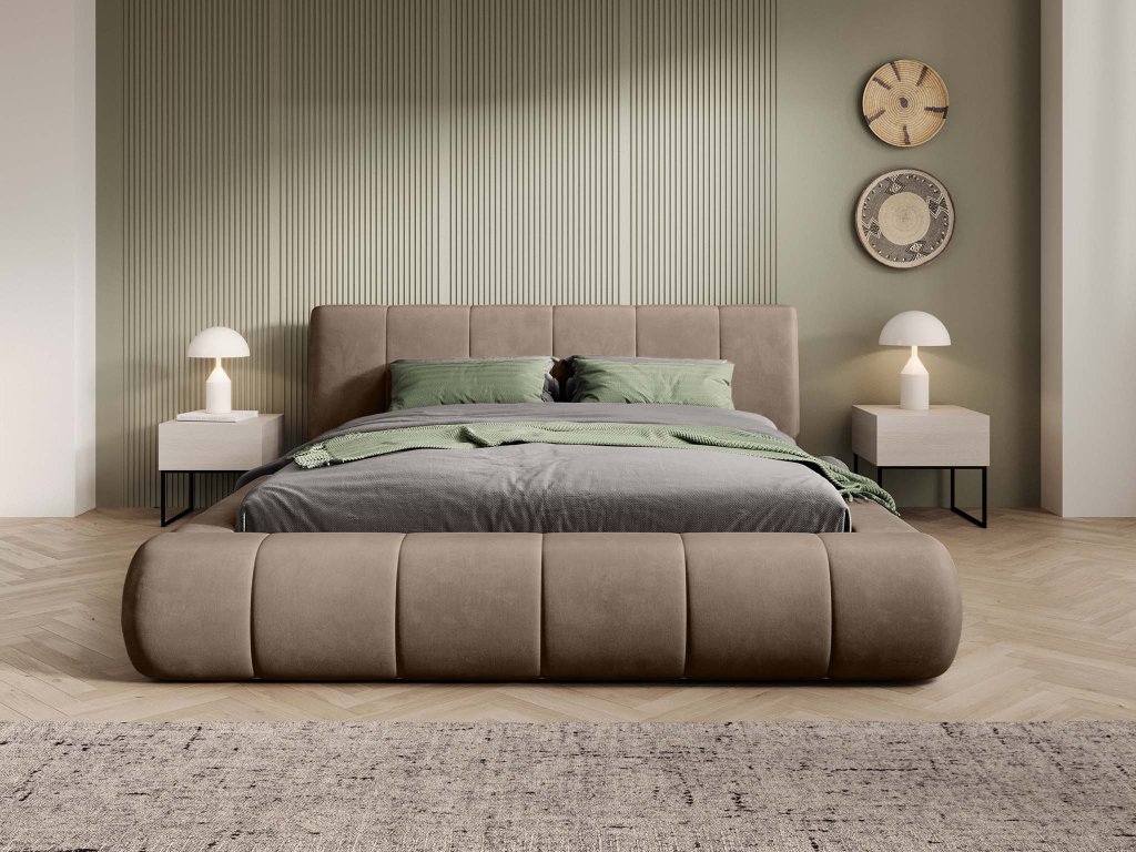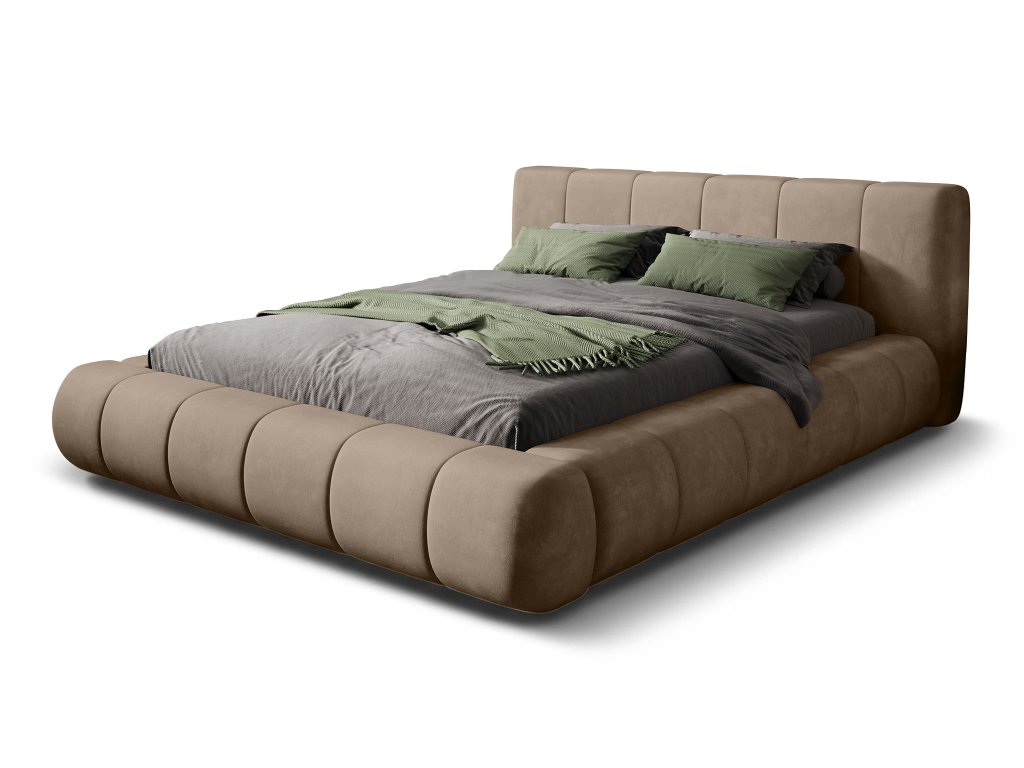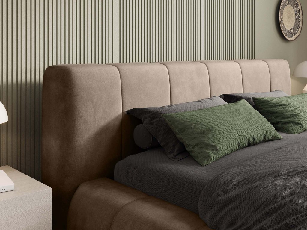 Čalúnenie postele je vytvorené z kvalitnej látky Velluto, ktorá zaujme svojou jemnou, až zamatovou textúrou a decentným leskom. Materiál je mimoriadne príjemný na dotyk, odolný voči každodennému opotrebovaniu a zároveň nenáročný na bežnú starostlivosť. Velluto dodáva posteli luxusný, no stále útulný vzhľad a krásne podčiarkuje mäkké, oblúkové línie konštrukcie. Spodnú časť postele tvorí funkčná textília typu Fibertex, ktorá zlepšuje cirkuláciu vzduchu a uľahčuje údržbu celej postele. Dno sa dá jednoducho odopnúť, čo umožňuje pohodlné vysávanie a udržanie čistoty aj na menej dostupných miestach.