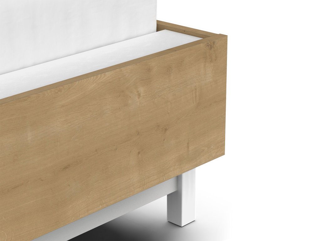 Manželská posteľ Draft v rozmere 140 × 190/200 cm je praktickým riešením pre tých, ktorí hľadajú štýlový a zároveň flexibilný nábytok do spálne. Kombinácia prírodného dekoru a bielych detailov pôsobí moderne a zároveň nadčasovo – skvelo zapadne do industriálne či minimalisticky ladeného interiéru. Rám postele je vyrobený z laminátovej dosky s hrúbkou 18 mm a stojí na stabilných bielych nohách.
