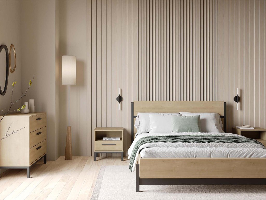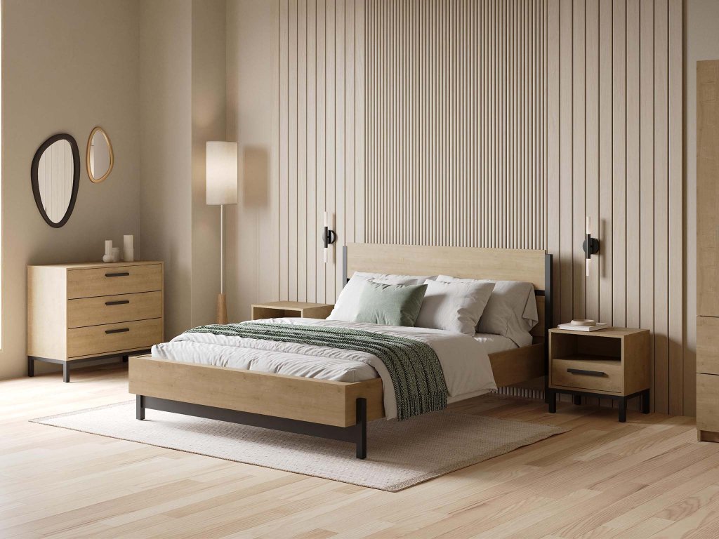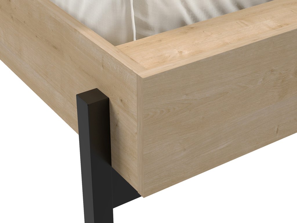 Manželská posteľ Draft v dekore prírodného dubu s kontrastnými čiernymi detailmi je skvelou voľbou pre všetkých, ktorí obľubujú moderný industriálny štýl. Vďaka svojej kompaktnej veľkosti a praktickým funkciám zapadne aj do menších spální. Posteľ ponúka jedinečné riešenie dĺžky lôžka – disponuje vyberateľnou vnútornou doskou, ktorá umožňuje upraviť dĺžku ložnej plochy. So vsadenou doskou je vhodná pre matrac s rozmerom 140 × 190 cm, po jej vybratí získate priestor pre štandardný matrac 140 × 200 cm.