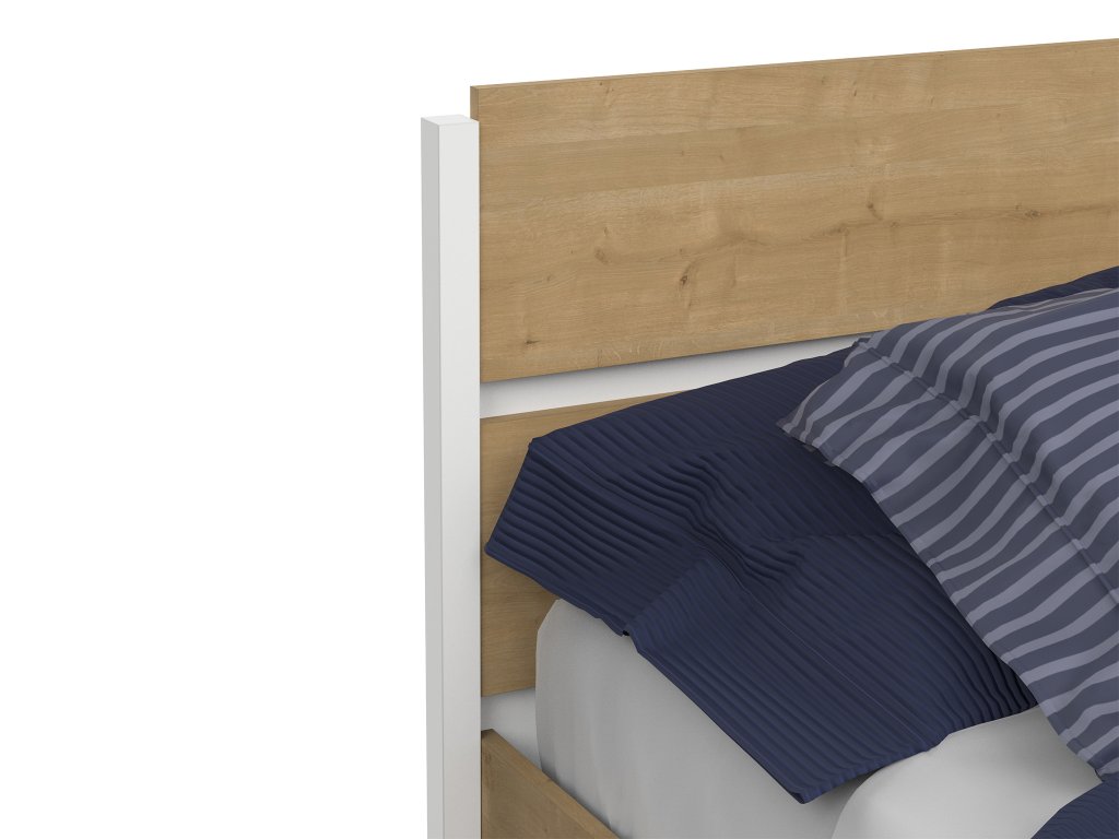 Štýlová manželská posteľ 160x200 Draft zaujme na prvý pohľad kombináciou prírodného dubového dekoru a kontrastných bielych prvkov, ktoré celej konštrukcii dodávajú moderný a zároveň vzdušný vzhľad. Ide o ideálne riešenie pre tých, ktorí hľadajú nadčasový dizajn s nádychom škandinávskej čistoty a zároveň ocenia praktickosť a pevnosť spracovania.