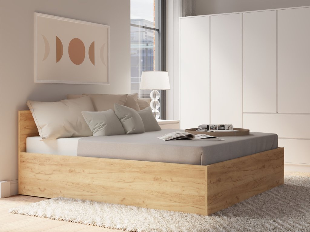 Konštrukcia postele je vyrobená z kvalitnej laminovanej dosky s hrúbkou 22 mm, čo zaručuje vysokú stabilitu a jednoduchú údržbu. Súčasťou je aj pevný kovový rošt s drevenými lamelami, ktorý poskytuje spoľahlivú oporu pre matrac. Odporúčaná výška matraca je minimálne 15 cm, pričom najlepšou voľbou je matrac vcelku. Vďaka neutrálnemu prevedeniu v odtieni dub craft pôsobí posteľ moderne a ľahko zapadne do rôznych interiérov – od minimalistických až po útulné prírodné štýly. Pre dokonalé zladenie odporúčame doplniť posteľ o nočný stolík Dolly New.