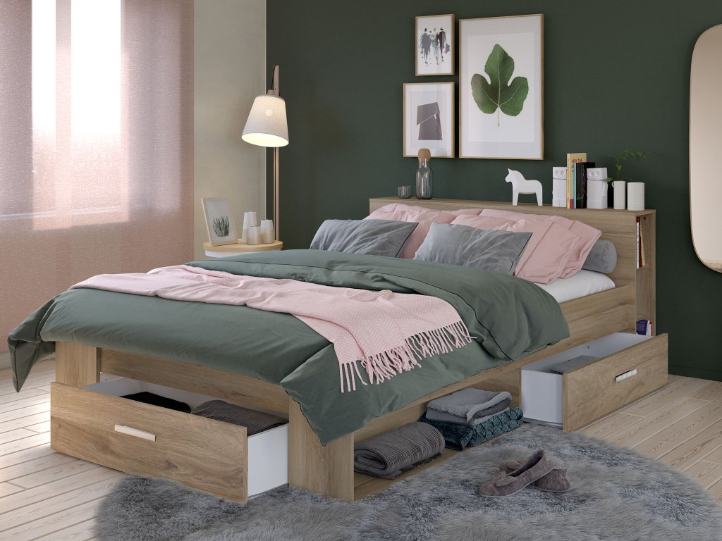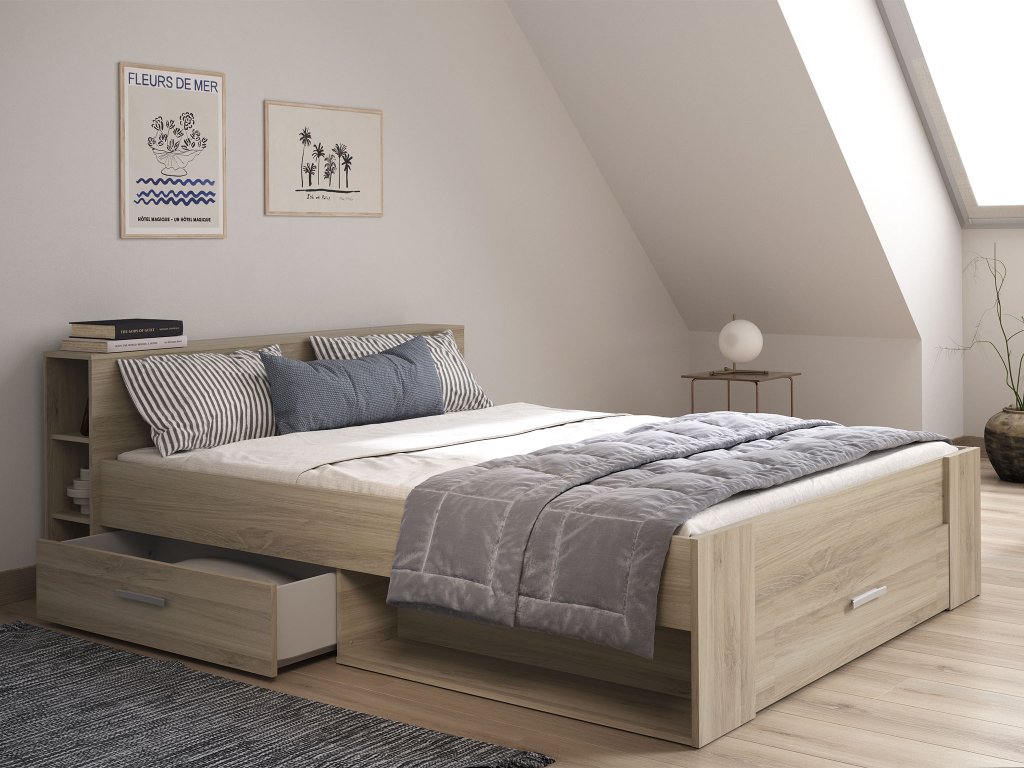 Čelo postele je funkčným prvkom s bočnou knižnicou, ktorá dodáva posteli vizuálny charakter a zároveň zvyšuje komfort pri každodennom používaní. Tri zásuvky namontované na kolieskových výsuvoch dopĺňa až osem výklenkov, ktoré sú elegantne integrované do bokov postele. Kombinácia drevotriesky s dýhou vo farbe dubu Kronberg pôsobí teplo, moderne a je zároveň odolná pri bežnom používaní.