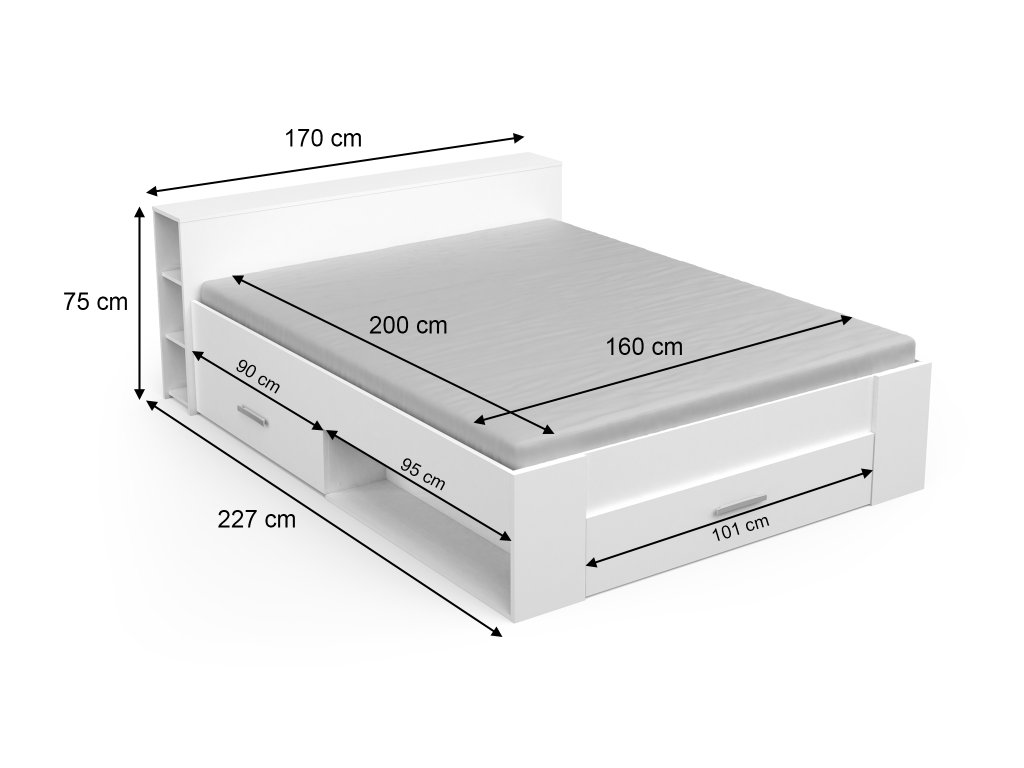 Posteľ je dodávaná spolu s tromi praktickými úložnými priestormi. Matrac, ani rošt nie sú súčasťou postele.
