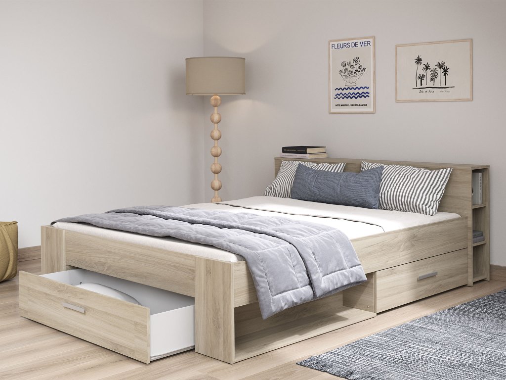 Posteľ disponuje až 3 priestrannými zásuvkami na kolieskových výsuvoch, ktoré uľahčujú prístup k uloženým veciam. Okrem nich ponúka aj 8 otvorených výklenkov, ideálnych na knihy, posteľnú bielizeň, dekorácie či každodenné drobnosti, ktoré chceš mať vždy poruke. Bonusom je vysoké čelo postele s praktickou bočnou knižnicou, ktoré nielen dopĺňa celkový vzhľad nábytku, ale zároveň poskytuje miesto na odloženie budíka, lampy alebo obľúbenej literatúry.